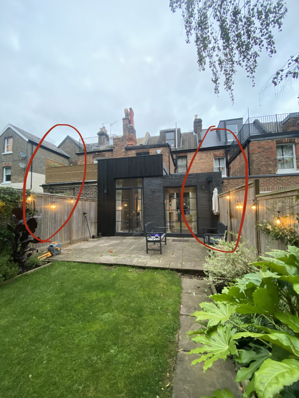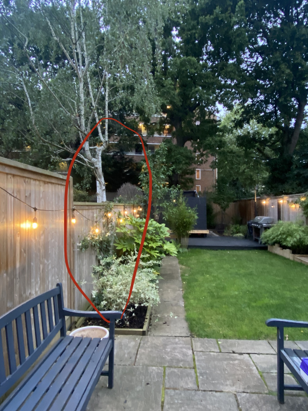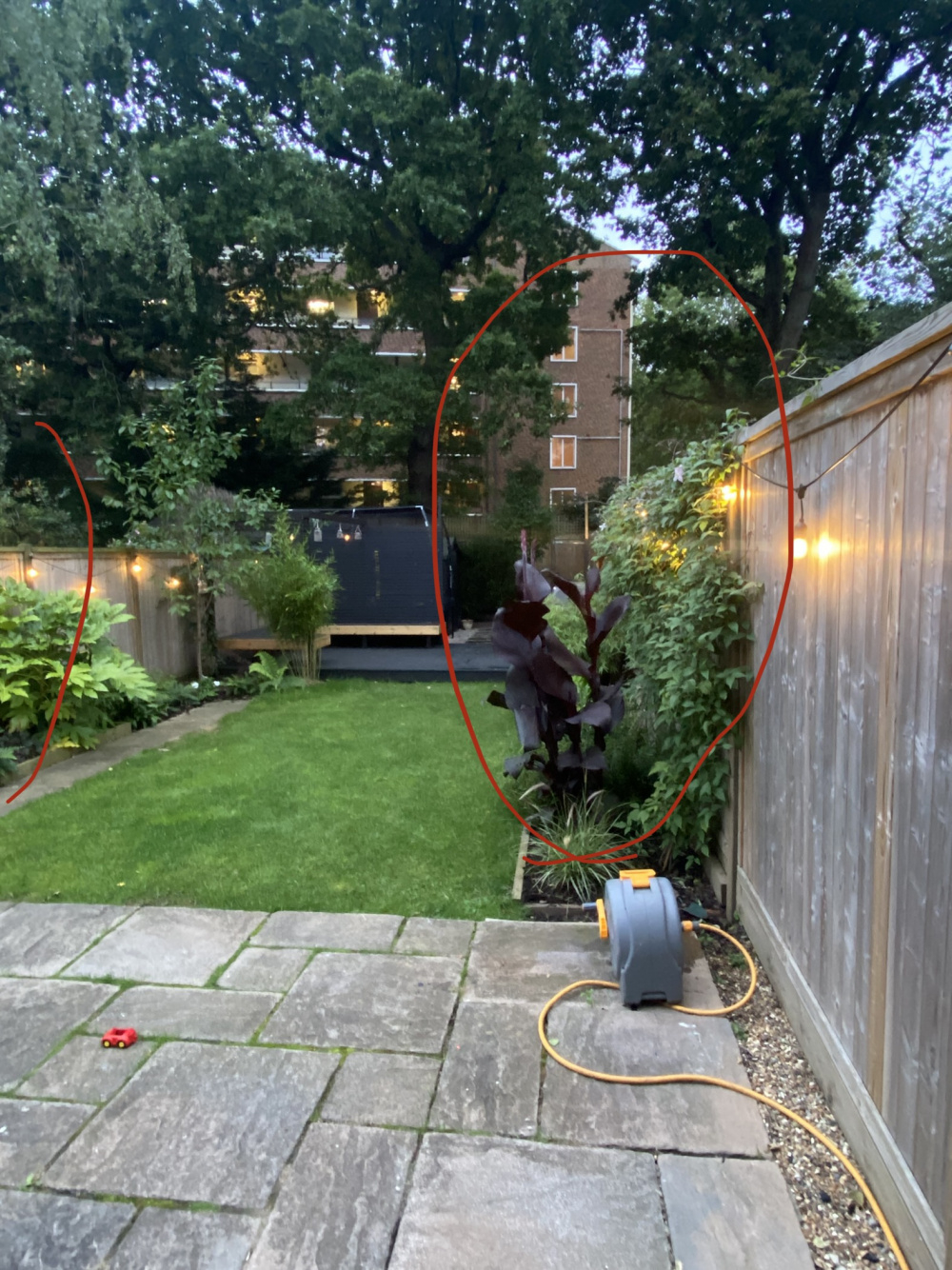 See pic. The patio will eventually go, to be redesigned with planting / more privacy / interest etc. Before this happens i want to get a head start and plant a couple of specimens, shrub or trees.