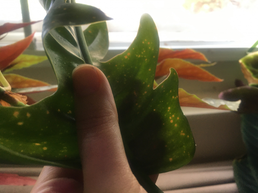on the philodendron narrow the damage is significant and the little yellow dots left by this pest weep