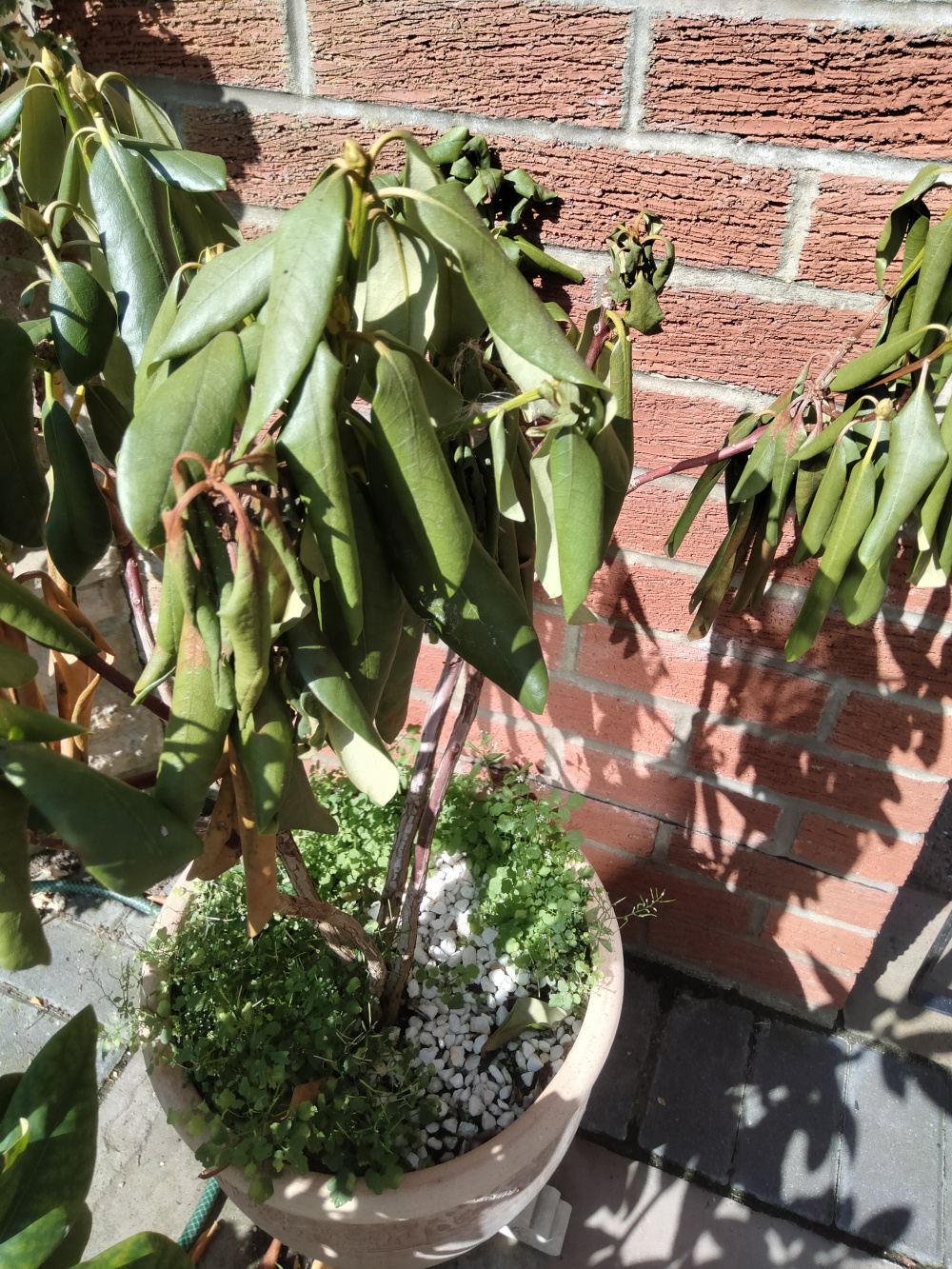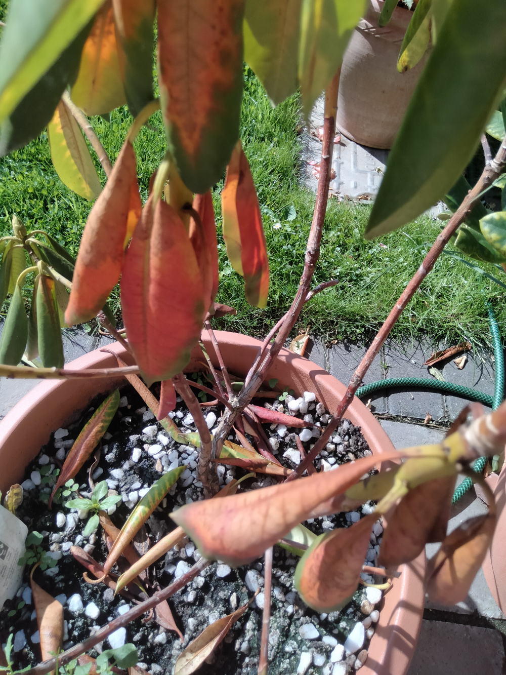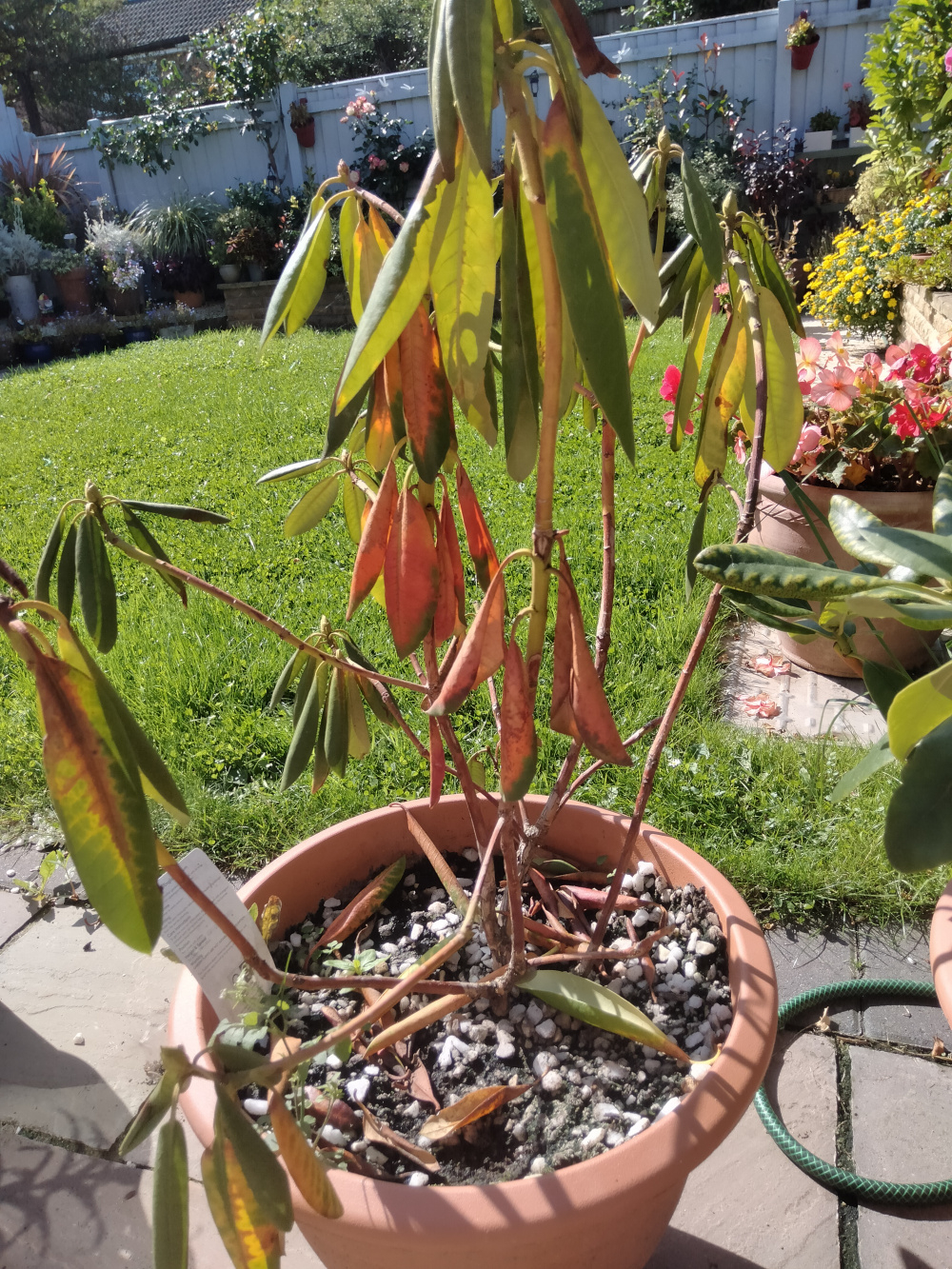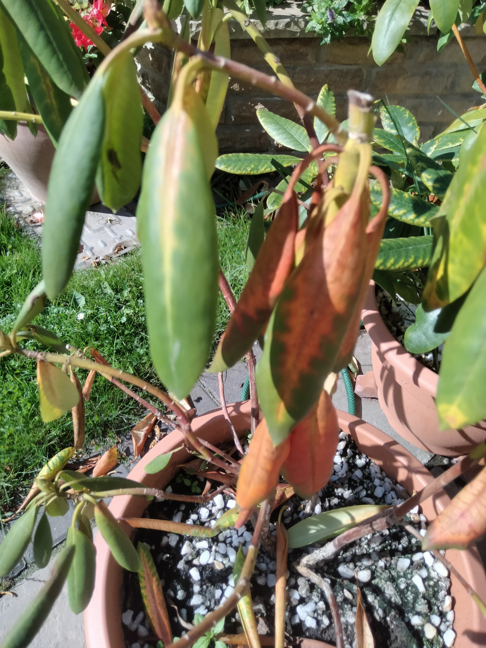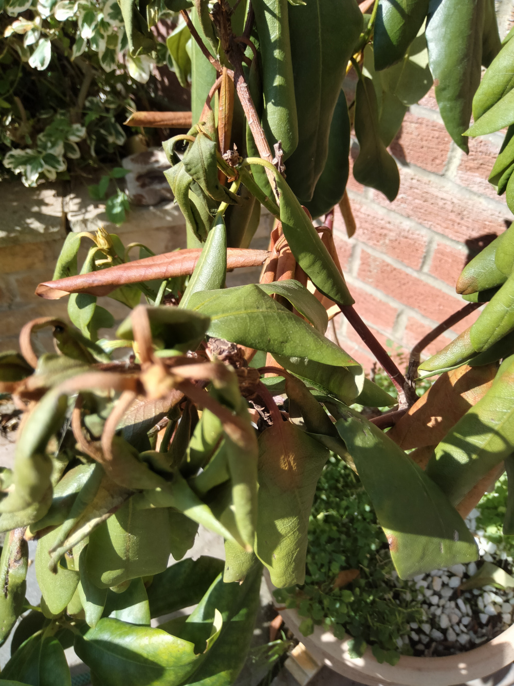 We have 3 Rhododendrons which flowered well this year and although we're not experts, we do water & feed them now & again. However, 2 out of 3 of them are really looking sorry for themselves. The first 'problem one' had most of it's leaves turn orange and fall off (see first 4 pics). The second 'problem one' has gone all 'droopy' and 'shrivelled' (see next 4 pics), but the 3rd plant seems relatively fine (last pic). The only thing I've done different this year is I tried to prune them which I've never done before and wonder if I've done something wrong. Any help appreciated much appreciated. Many thanks Karen
