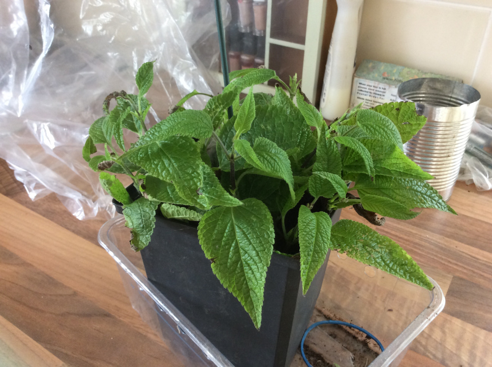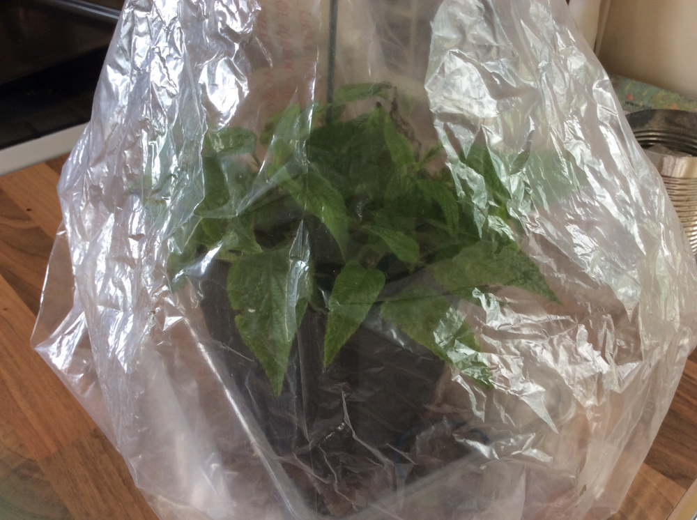 Attempt 3: Same as attempt 2, but dampened rather than soaked the compost, and this time tried a "pot-within-a-pot" with the outer pot supporting the sandwich bag (a bit like the pics @Lyn showed us) so the bag isn't in contact with the leaves. Also left only a couple of small or half-leaves on each cutting this time instead of 2-3 bigger ones.