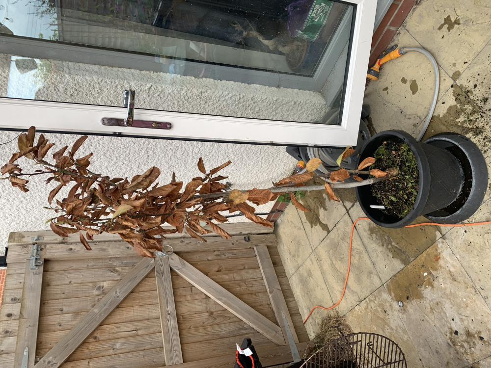 I recently went on holiday for two weeks, and have come back to a very sad looking plant. Its leaves are all brown, and curling inwards. It lives in the garden with the other plants, and they seem to be fine. It sits in a sunny spot, where it will get sun for most of the day. There are also some weeds growing in the pot which I assume I should probably remove.