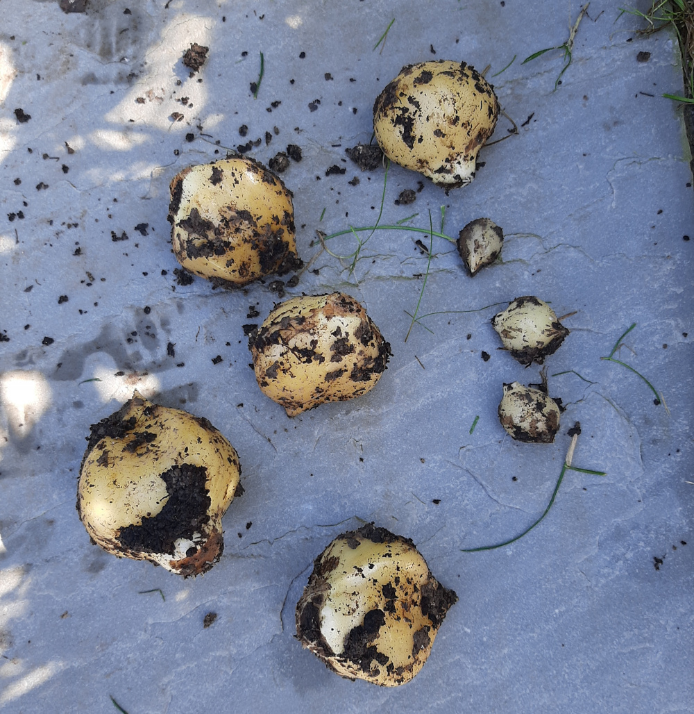 Since I am not that good at keeping bulbs alive in pots, I usually put the babies back in the soil with the parents.