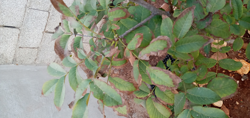 Anyone able to advise on the state of my walnut tree...based in north africa i think its eitger zone 10 or 11 had quite a dry harsh summer and so watered every 2 days or so...2/3 times a week. Soil is quite a hard soil almost clay which ive added compost to and sometimes mulch...