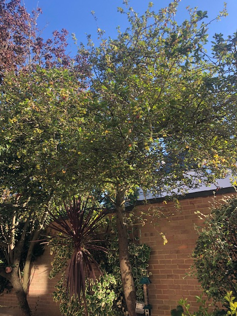 Dove, here's the cherry tree. The tree must have been in the north shadow of the back of the garages when young, but they soon reach the sun. You can grow in the shadow areas. You just bring them up to a good height in a big container first.