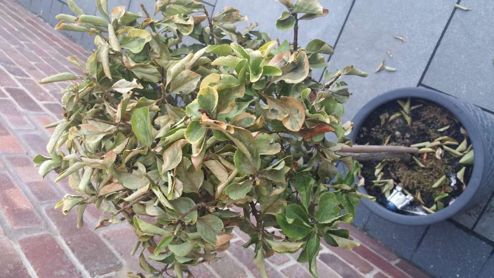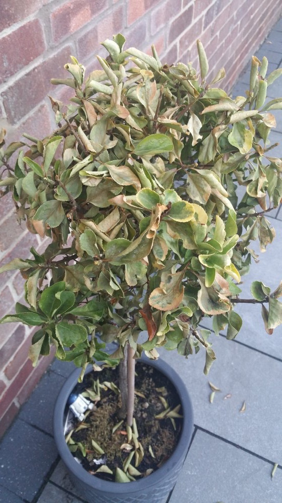 They are a euonymus but I'm not to sure what kind. They usually have yellow leaves. We have had a lot of rain but maybe they've been sheltered a little being near the house. Should I give them some water maybe just to be sure? They are in a John innes soil, again I'm not to sure but maybe John innes 2? I think we've had them about two years and they've not had a soil change in that time although I did dig in some blood, bone and fish in spring, was that OK to do. They've been fine all that time and only recently has this happened. They had new growth on them this year so I had to clip them back a little earlier this year aswell. No the pot is not very tall, I can't get a photo at the moment because I'm at work. They are quite large pots though and have drainage.