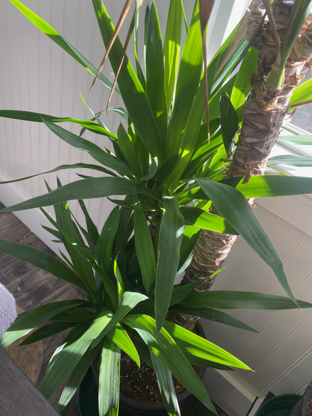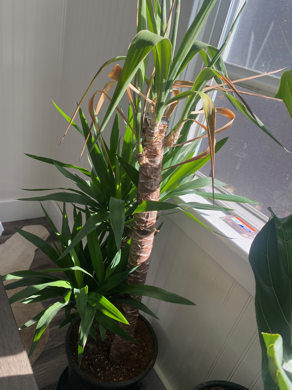 Hope you guys can help me with this! I bought an indoor yucca plant about 4 months ago, (three yuccas in one pot). It was placed next to an east-facing window. ~1-2 months ago, I noticed the lower leaves on the top yucca plant drying out. I've tried moving it away from the window, thinking it was getting too much sun (since it was only the top yucca that was affected), but that didn't help (so I moved it back to the window after about a month). I was watering it about once every 2-3 weeks initially, but now have tried just watering once a month now, in case I was overwatering it.