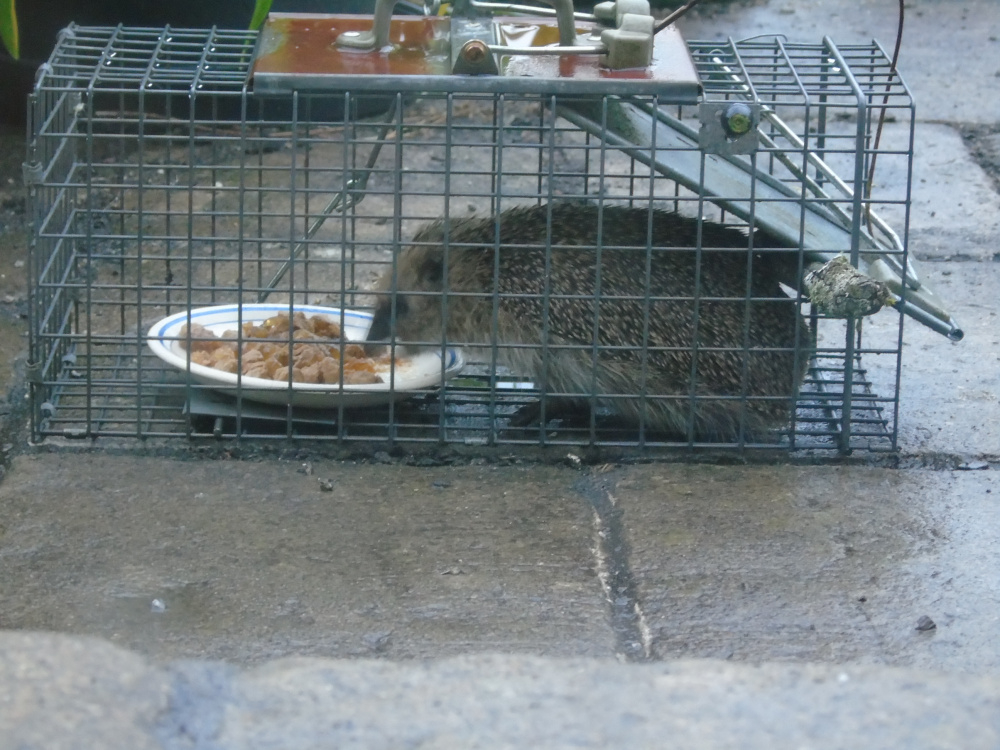 I use a trap, with a stick to stop the door closing ( keeps the local cats out ). My wee Spikeys come every night around 9pm.