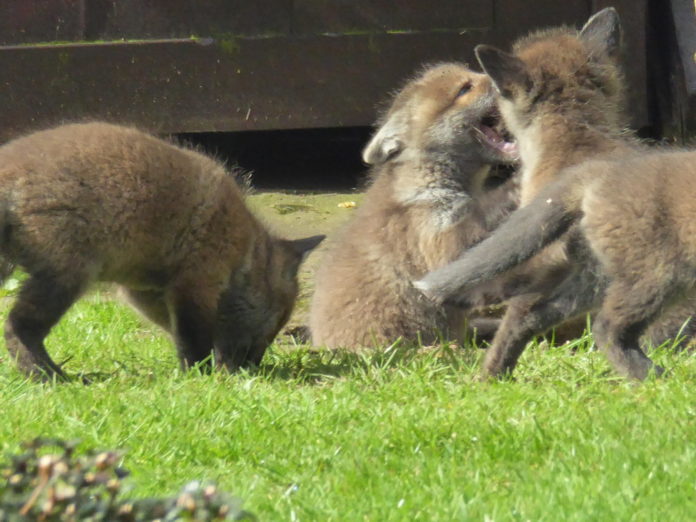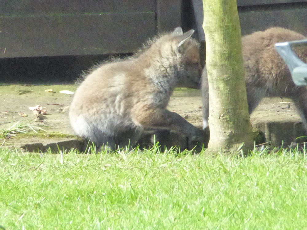 We then hardly ever saw her. But then at the end of March I looked out of the kitchen window one day and saw this. Fiona with three cubs, one under the tea-house steps.