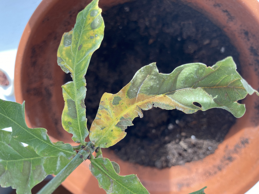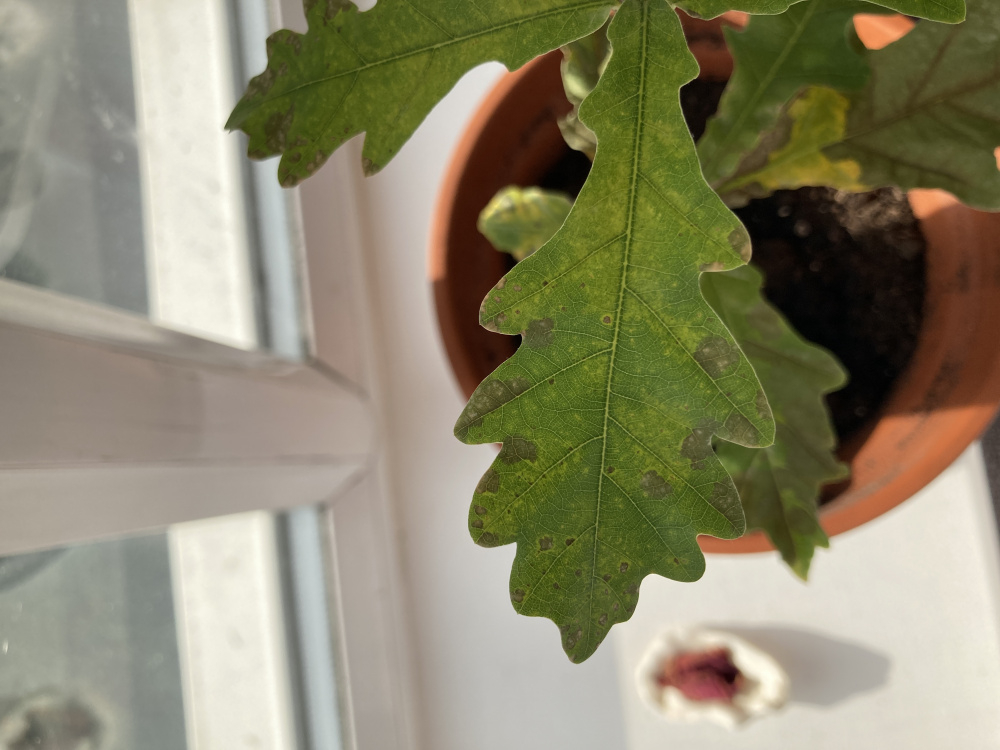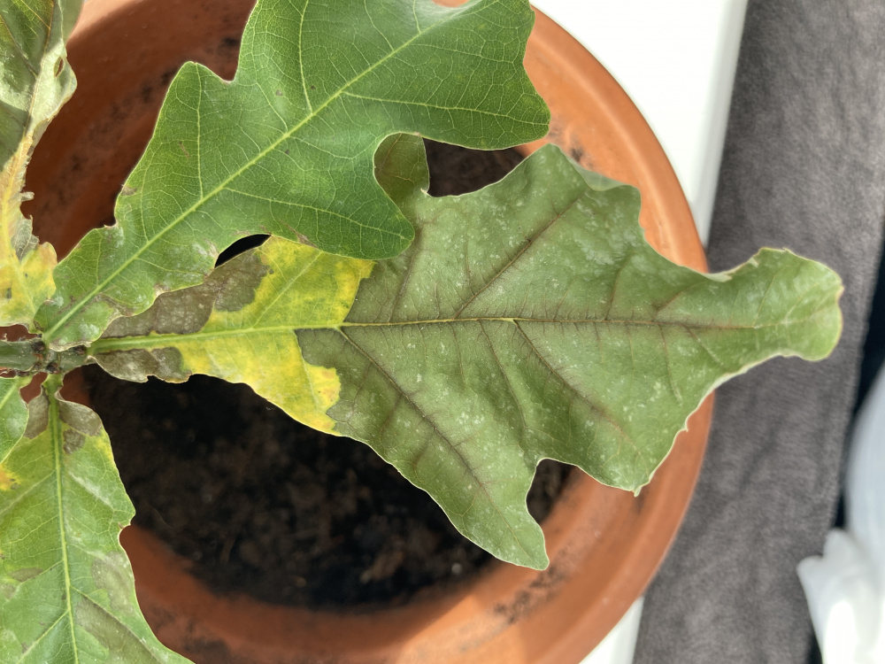 H, I have been growing an oak tree from an acorn since last november. It has been going well until a few months ago when I noticed a white residue, almost powdery like substance on some of the leaves. At first I just wiped them off but then it seemed to be on more leaves so I spoke to a man at a gardening shop and showed him photos and he said that I needed to water it less and to loosen the soil and just wipe down the leaves. I have done/ been doing these things but it seems to be getting worse. Any advice would be greatly appreciated as to what I can do as I would really love to keep it happy and healthy. I am attaching pictures so that you can see what's going on. Thanks in advance!!