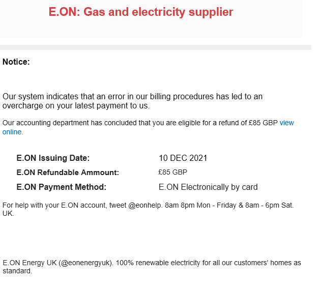 I am with EON and I've yet to receive any notification of a "refund". I'd suggest the act of asking someone to "Tweet" ( unless this is aimed at birds only ) is a bit of a giveaway I'd doubt that EON provide 100% renewable electricity as standard either