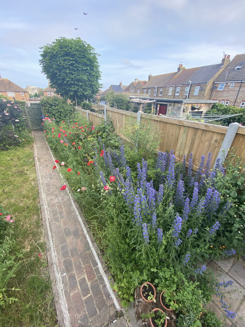 We did love the overgrown poppies and other random wild flowers and were very proud of all the insects and bees that came to feast in the summer (I harvested some of the poppy seeds to re-sow as we were thinking to mulch or put grass down) so we want to make sure we keep lots of goodness for the wild but also make it a nice sociable space.
