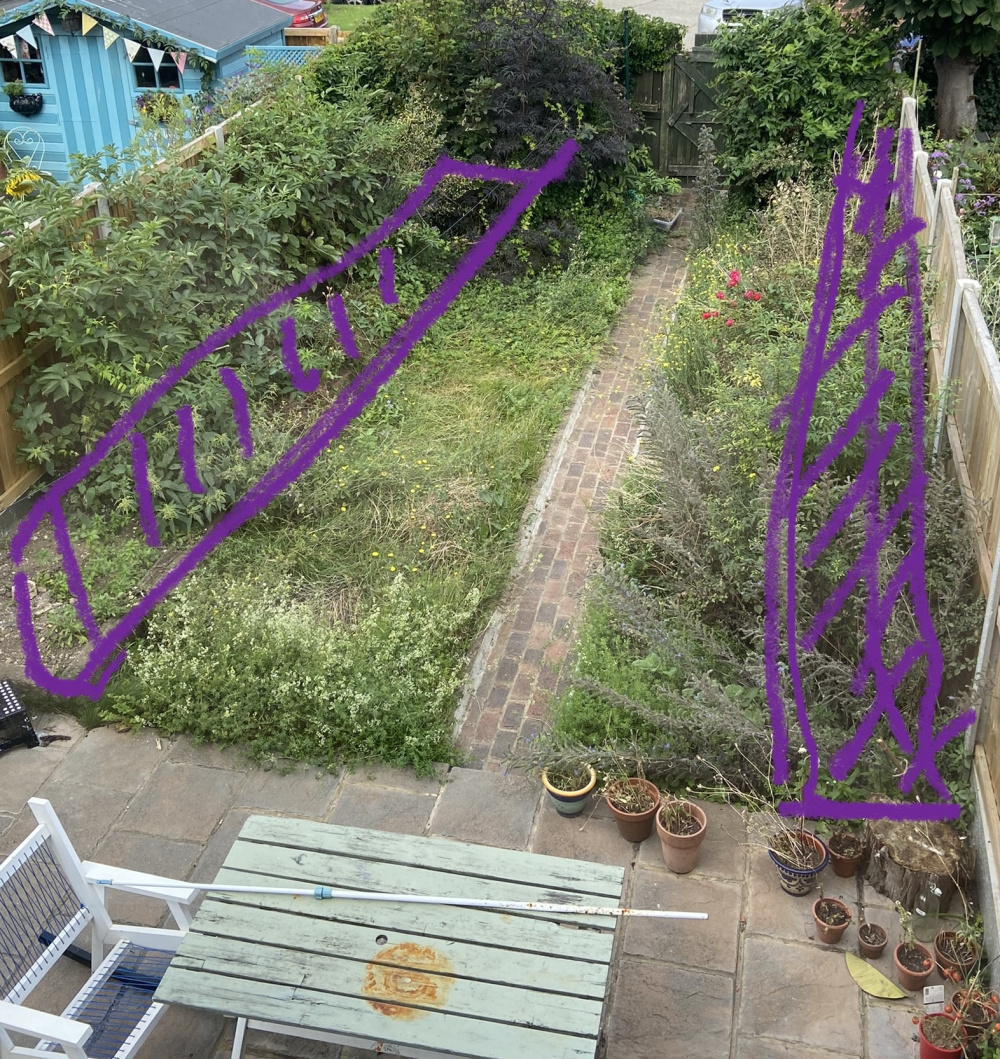 In response to not having grass, I guess I’m struggling to think of what to put instead. It’s hard to see but there are actually beds partitioned off running down on both sides of the fence. (I’ve added a photo with purple to indicate where the beds are) This, I guess, is where the original owner had done all the planting and then grass either side of the path. Maybe we could have some gravel or stones there instead.