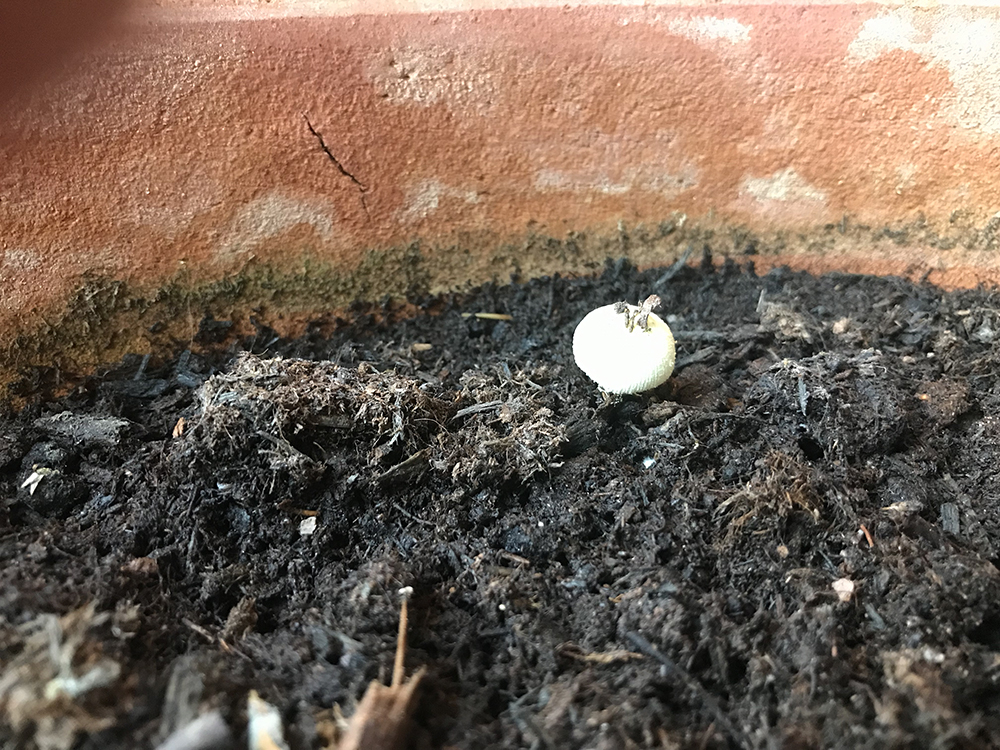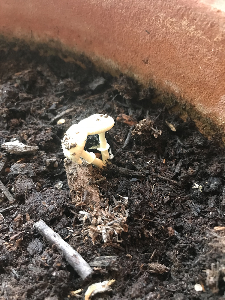 Mushrooms growing in lemon tree pot