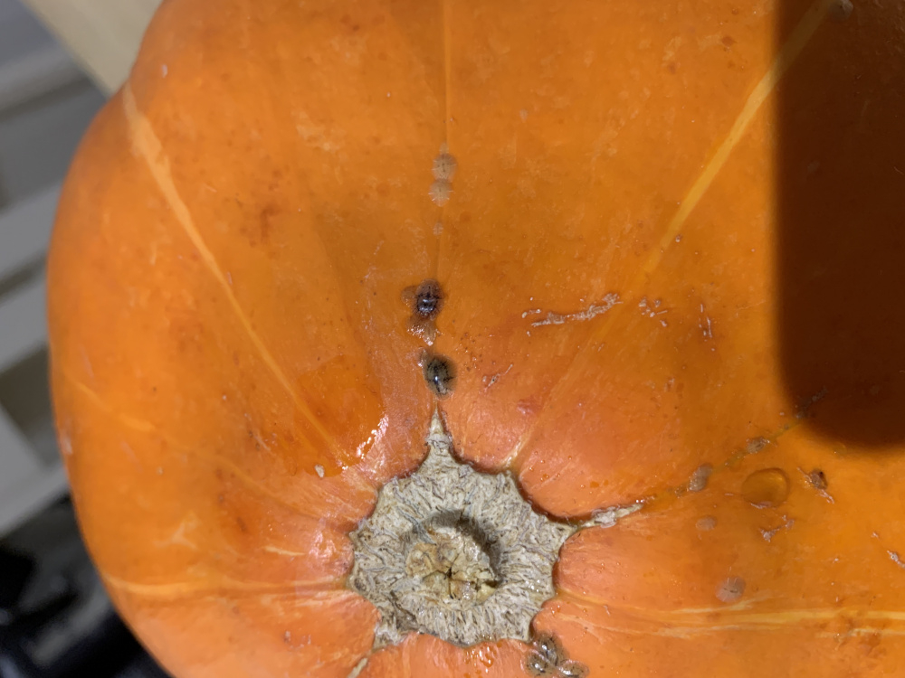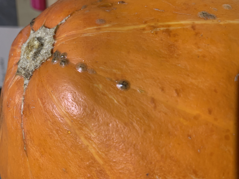 We had our first successful home grown pumpkin this year which we’ve had on the side waiting to be cooked for a few months. A few weeks ago we spotted a couple of these slug looking growths on the skin, they look like insects but don’t seem to move or eat the skin or anything. We removed them, cleaned the pumpkin and put it back on the side. We’ve just taken it down again to cook today and there are now dozens of them clustered around the base. Has anyone come across these before? Any help much appreciated, thanks!