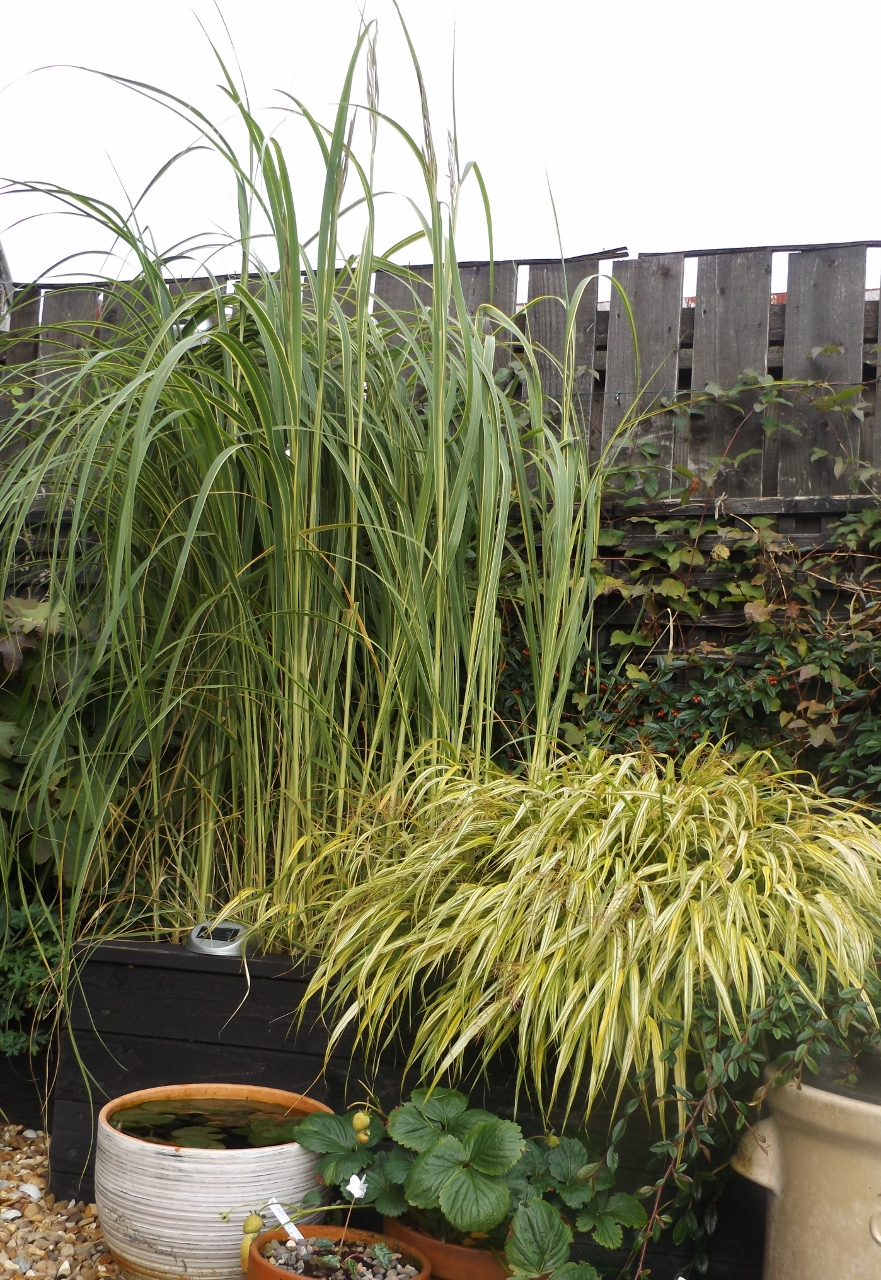 I grow the grass Spartina, which is very useful. As it's a seaside grass, it copes with wet/drought, sun mainly, but it's also perfectly happy with some shade, and in heavier soil. Gold/green variegation, and forms a big fountain-like clump, with tall flowering spikes. It does spread, so best kept contained a bit if it's in a border with other desirable plants. Fades gracefully too.