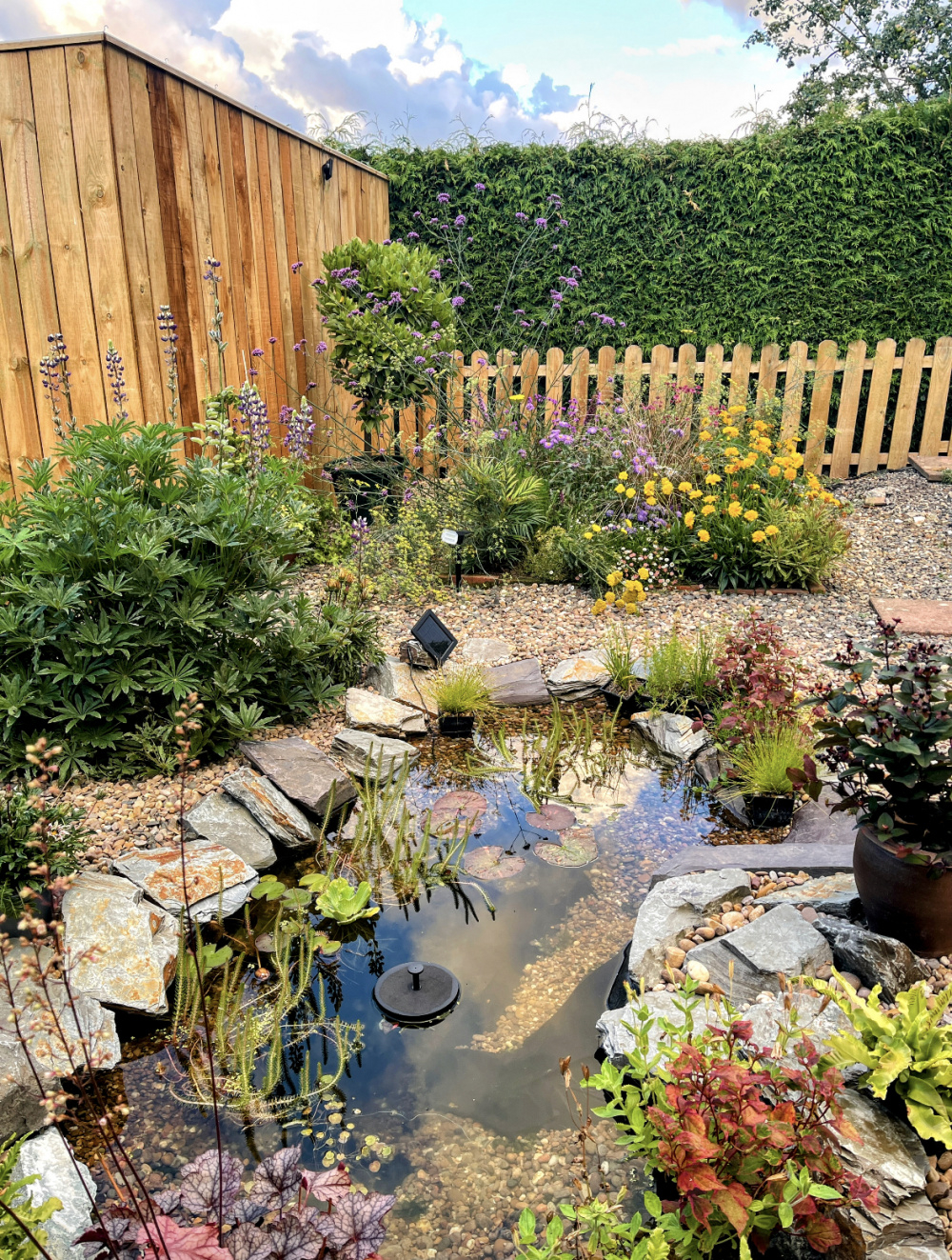Delightfully, we now get to enjoy this transformed space with the help of a lot more greenery than we had in May. The honeysuckle has started its scramble offer the trellis, the clematis is doing its thing on the back fence, the grasses and verbena have gone well and the pond has filled out nicely. The 'lawn' was laid two weeks ago and has taken well - we've only done that small space because we didn't want to have to dig it up when knocking down the garage.