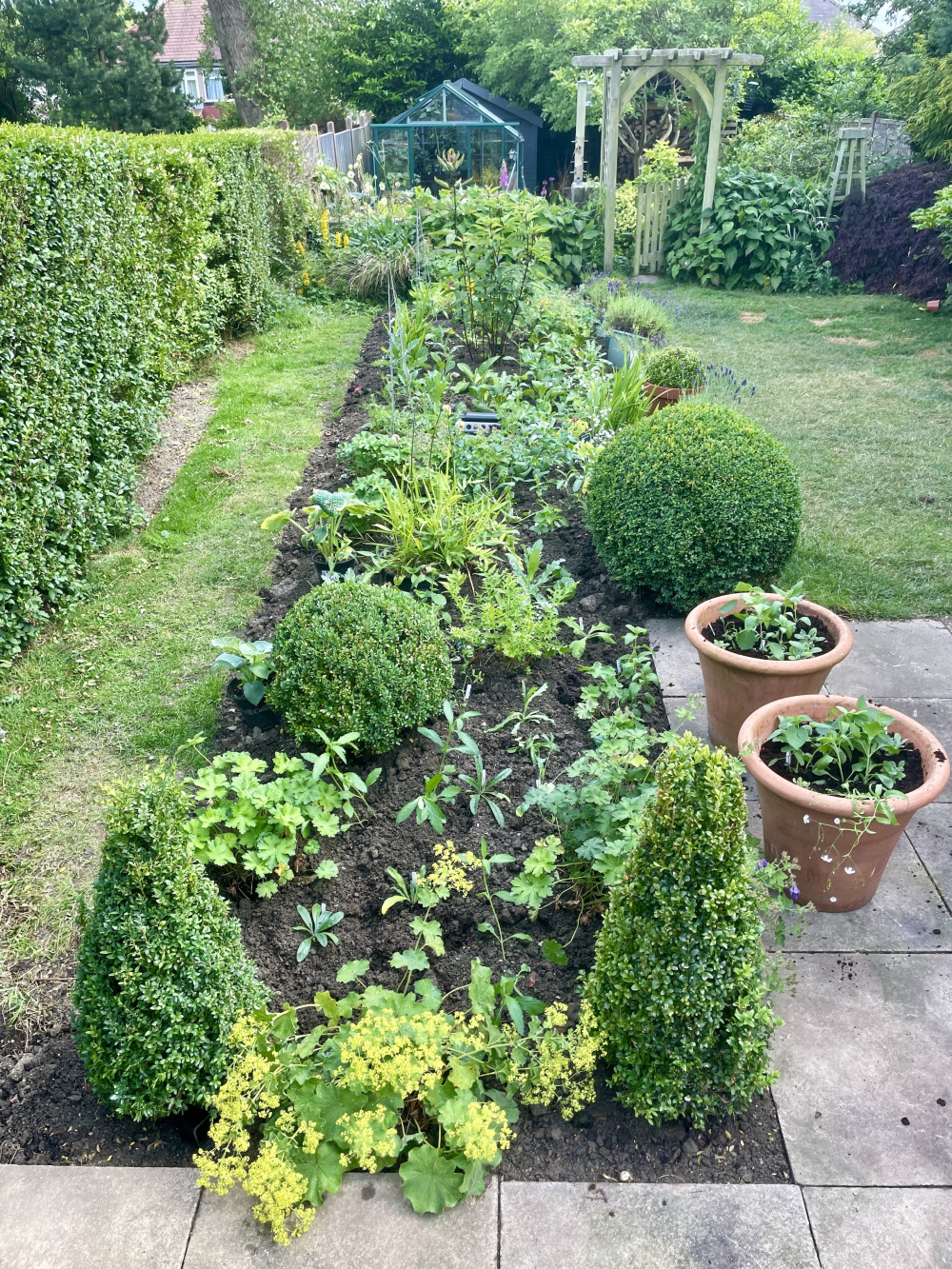 The pergola looks bare but I've got a honeysuckle going great guns on the left side and a vine just planted on the right, both of which I'll train up and into the back corner. The plan is to fill out the space with the pyracantha that you can just see and put a trellis across the longer span up which we will run some clematis. The idea between the two clematis already there, the honeysuckle, pyracantha and trellis will be to create a green wall all around the patio. Next year.