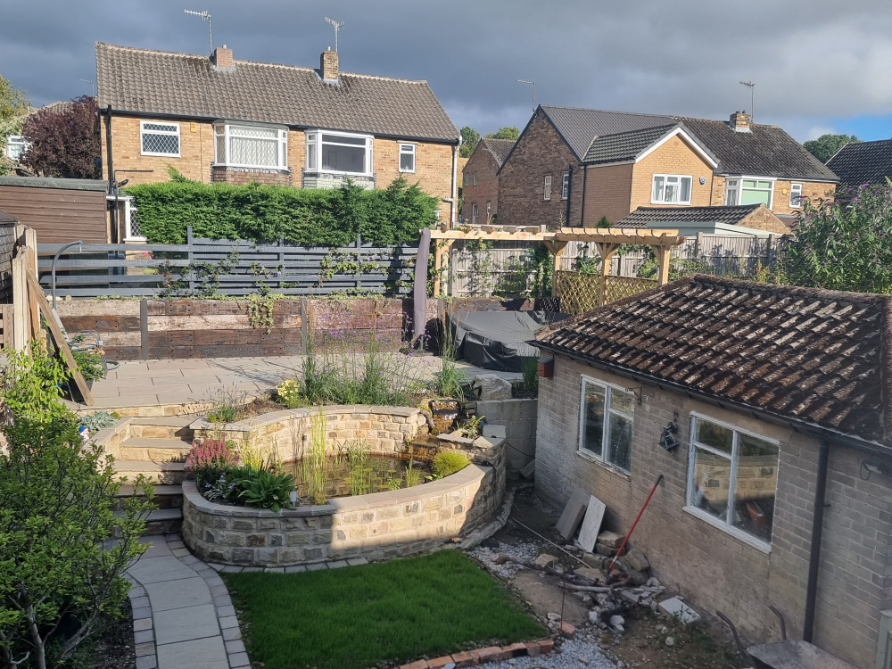 Still very much a work in progress and the first of the plants only went in this March. The garden is on hold now because we'll be knocking down the garage to make space for a lawn which will cover all the ground to the right of the path and front of the pond, almost right up to the house. Once the garage has gone, we've got to face the blockwork retaining wall behind it with more of the reclaimed stone and I'll then tidy up the loose coping stones on the right of the waterfall.