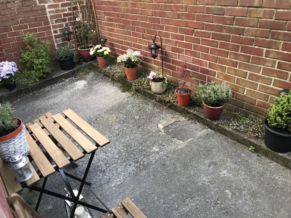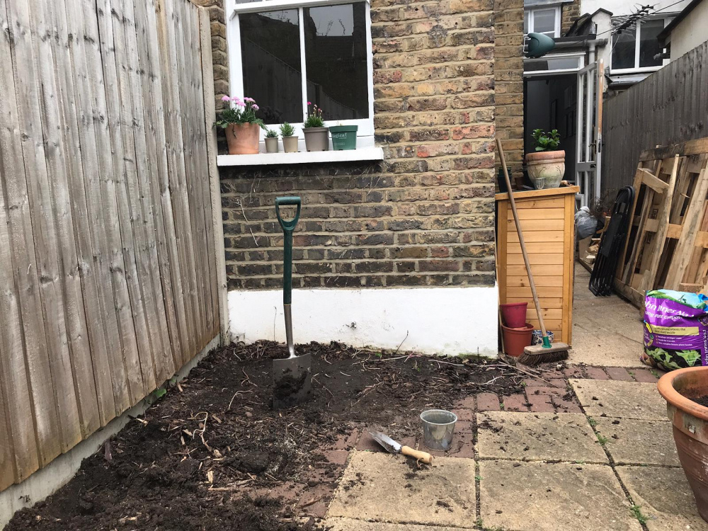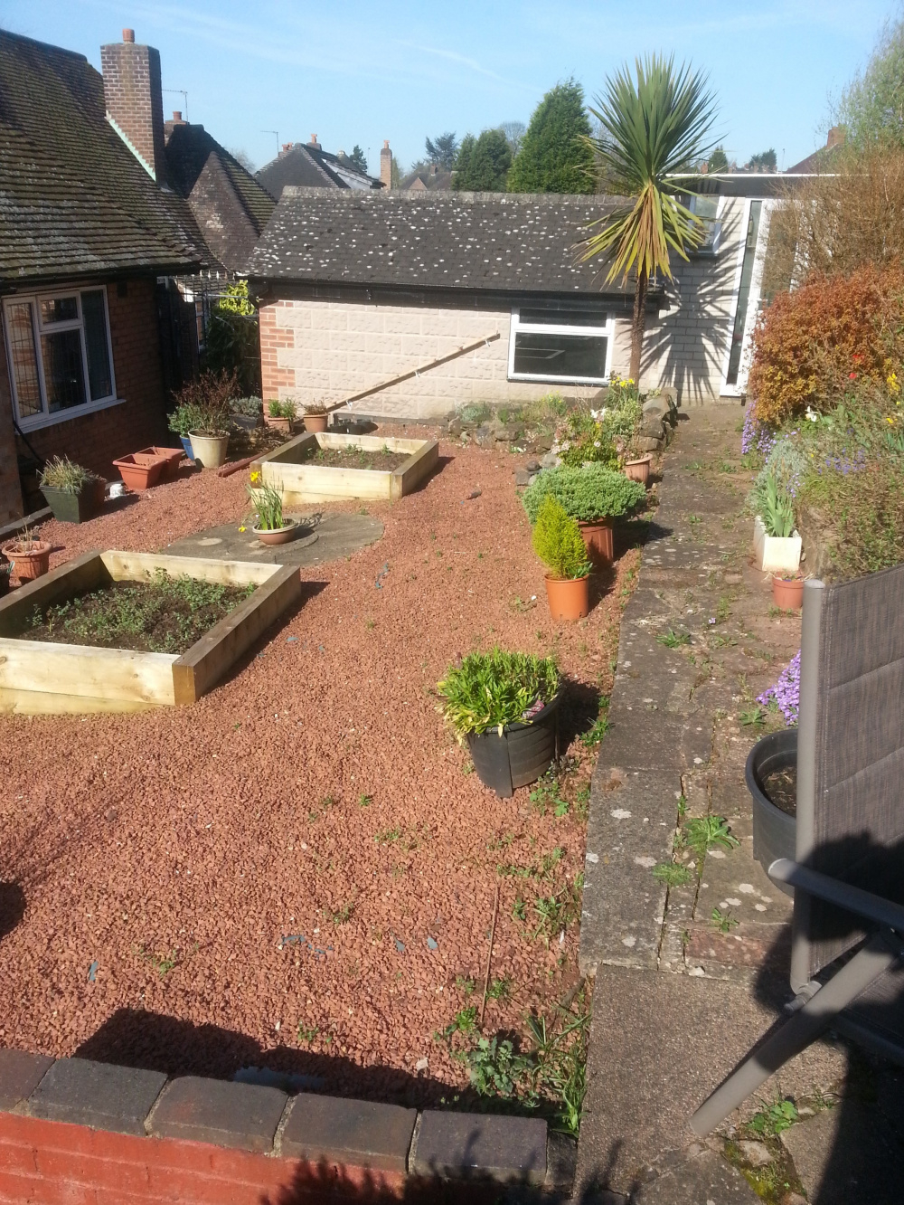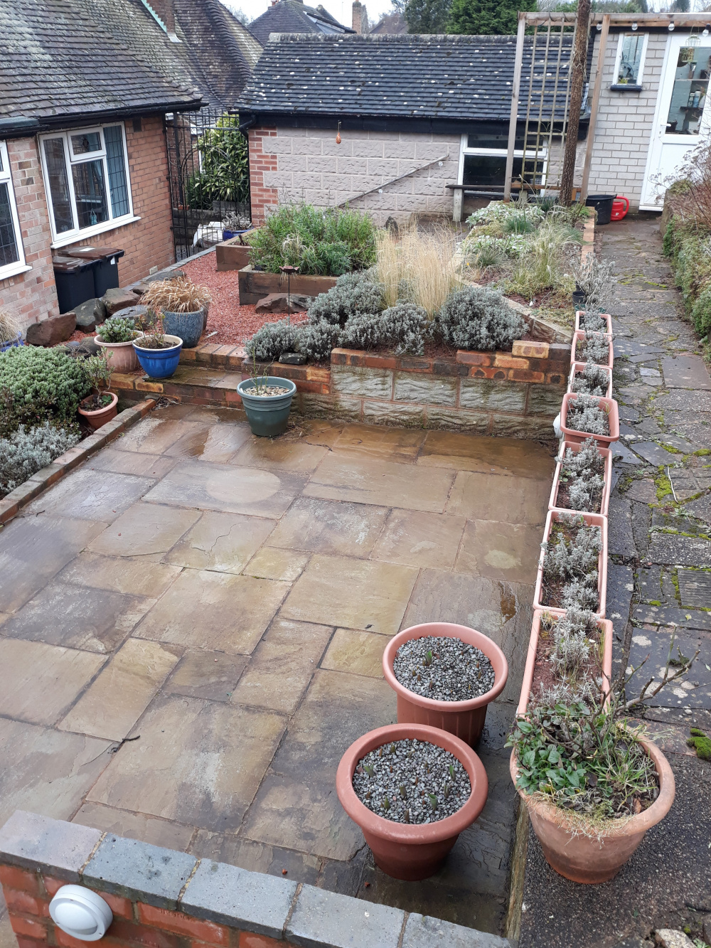 Patio area April 2018 April 2019. Note single gate between garage and house. 15 Tons clay dug out by hand and carted to skip located on drive at front. July 2019. Nice clean new patio, area behind (in front garage window) is now new rose bed July 21 This morning patio labs not quite so clean now... This is the biggest single project tackled so far