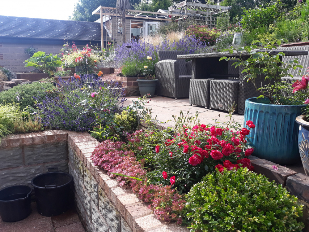 The existing slabbed area relaid and extended to form new seating area bed. New grass island at far end of garden created last year to enable me to create a new rose bed adjacent lower patio.