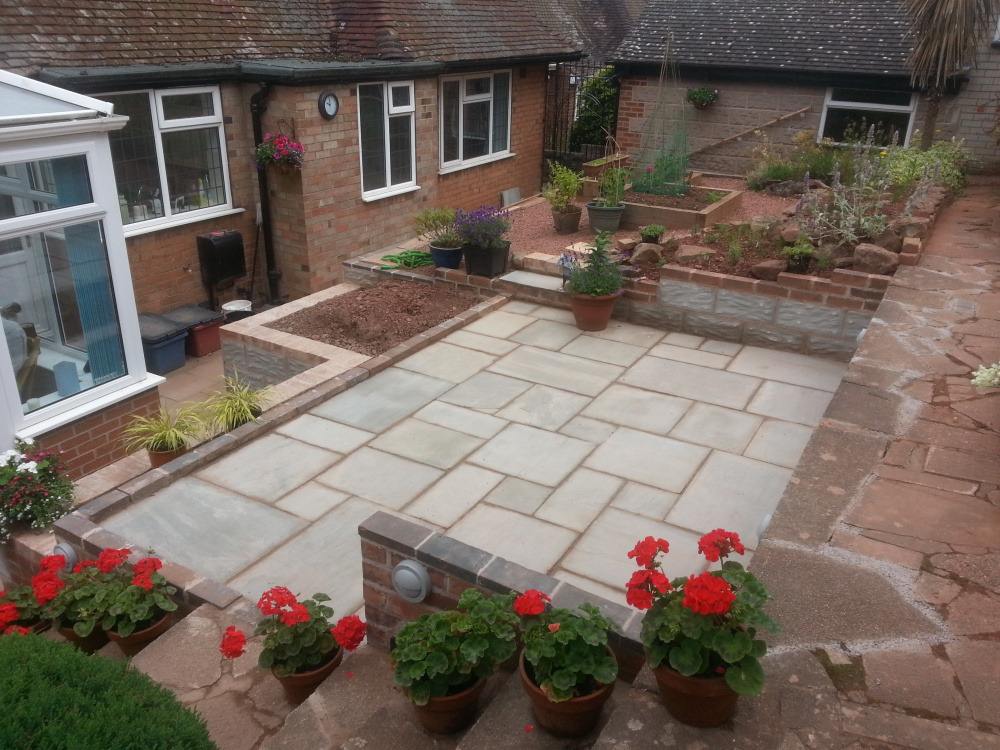 Nice clean new patio, area behind (in front garage window) is now new rose bed