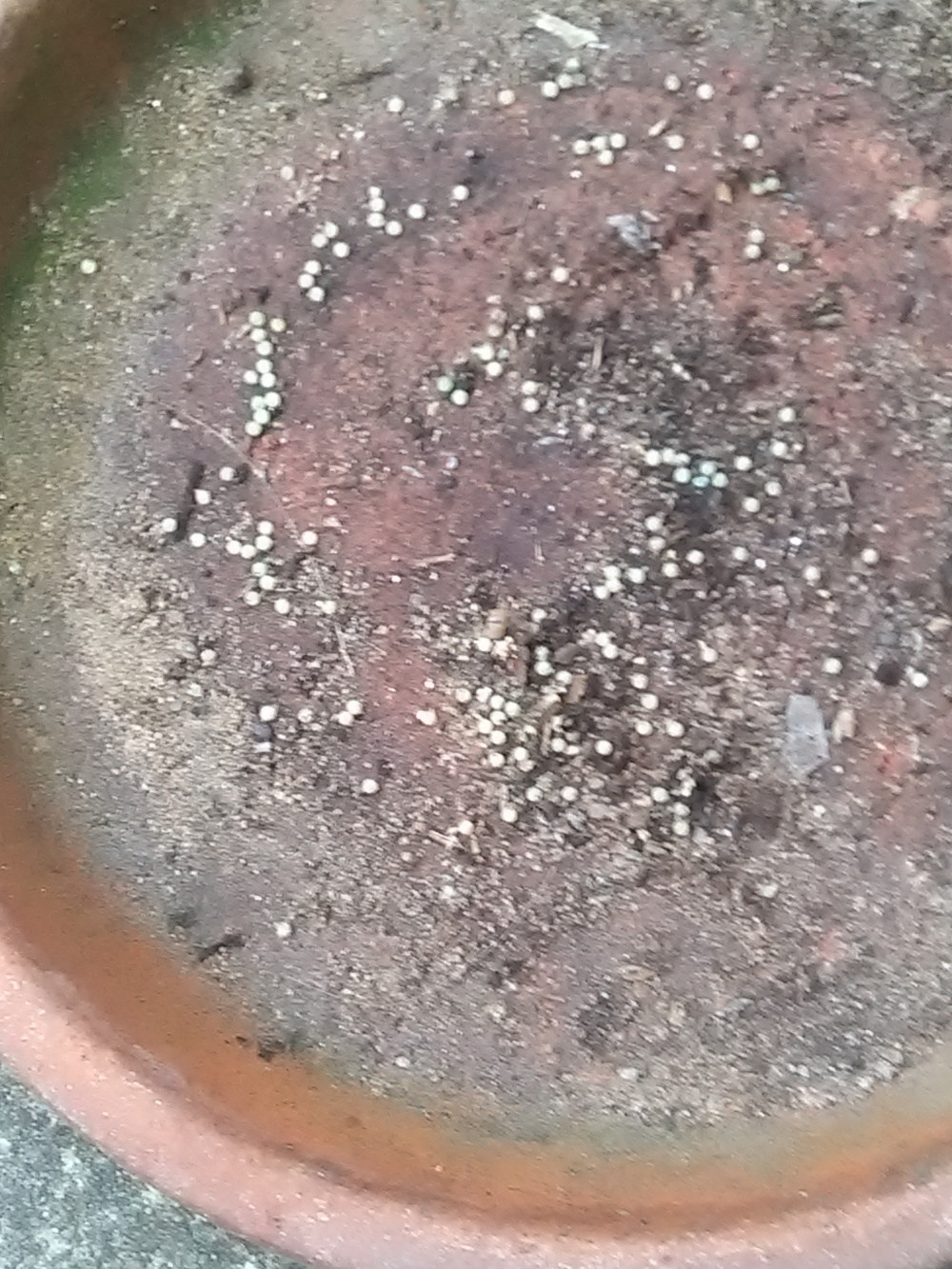 Please help identify these tiny white eggs. They are smaller than snail eggs I've seen before. I found them in the saucer under a plant outdoors, a few days ago.