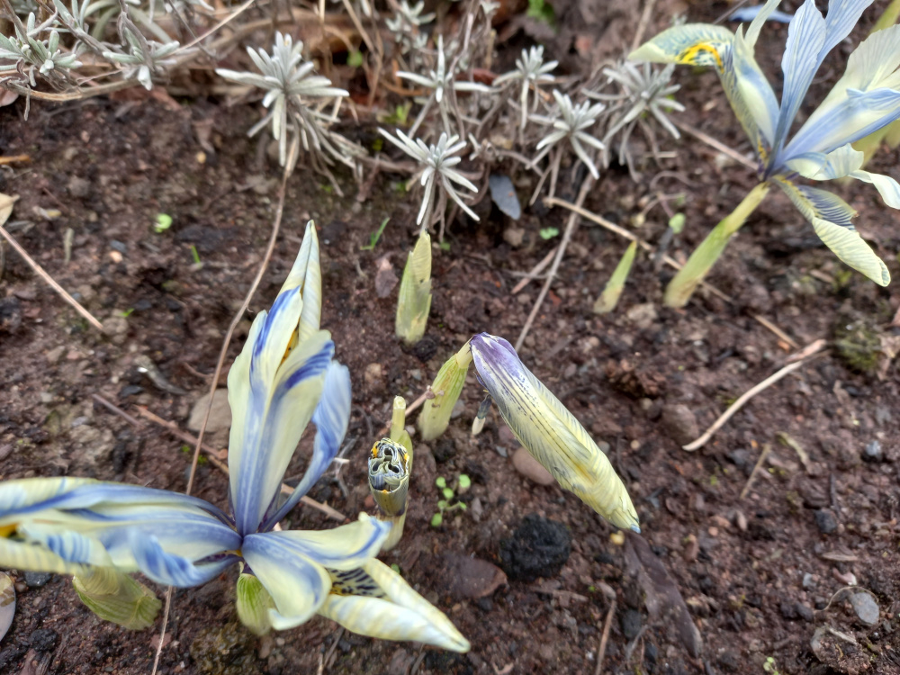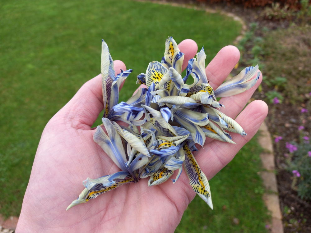 I've a row of ~60 iris Katherine Hodgkin which are in their second flowering season and have been flowering over the last week. Almost as soon as the flowers have appeared, they are detaching and dropping, several while still flower buds (as in pic). I don't recall this happening last year. It's not been windy. I wondered if a cat was brushing through (but not an obvious thoroughfare). Thought, as little rain recently, maybe dehydrated (but have watered). Maybe being eaten by slugs/snails? Unconvinced/uncertain about each! Has anyone experienced/explained similar with dwarf irises, or have any ideas?