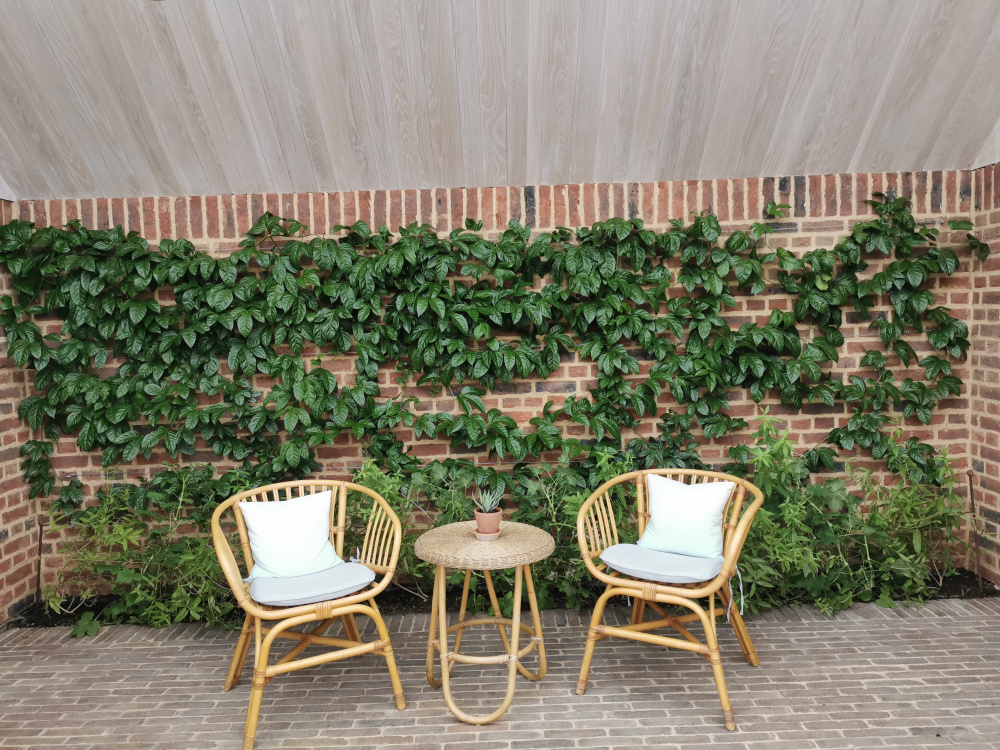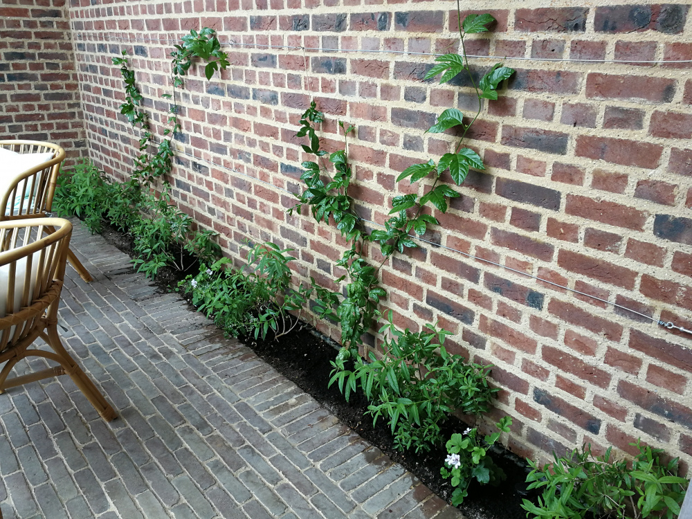 It was planted in a container and trained to cover half the roof and 1 south facing side. I didn't prune - just a bit of tidying early Spring.