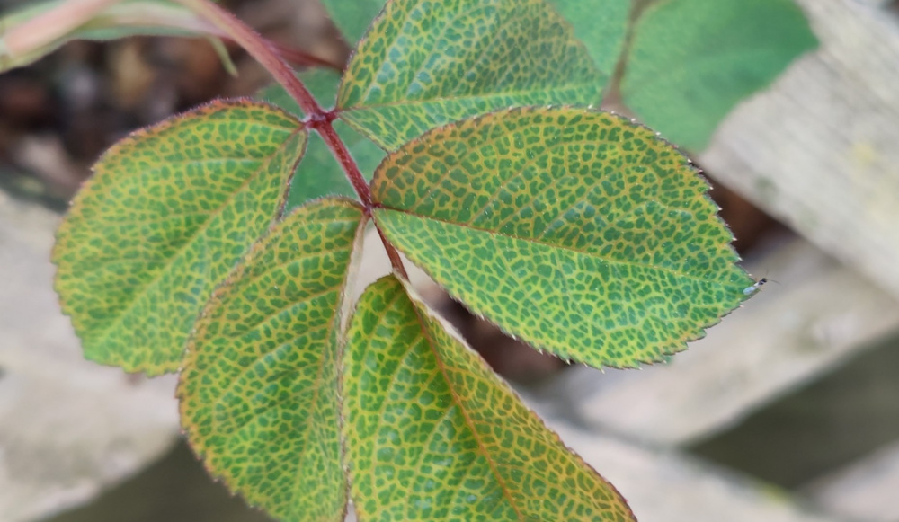 .. @Razzyrose Hi again... thanks so much for your comments. Yes that's Rose Mosaic Virus I would say, that is if your rose is grafted onto 'Dr. Huey' ?? it typically affects David Austin roses in the U.S. as they graft their roses onto virused rootstock. Apparently it isn't commercially viable to graft onto certified virus free rootstock. It can disappear some years, and does not affect any of your other roses. It's unsightly but benign is what I'm saying.