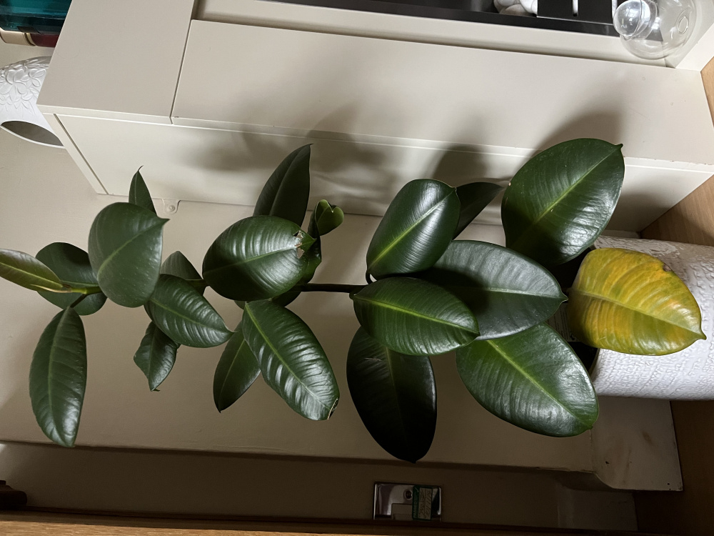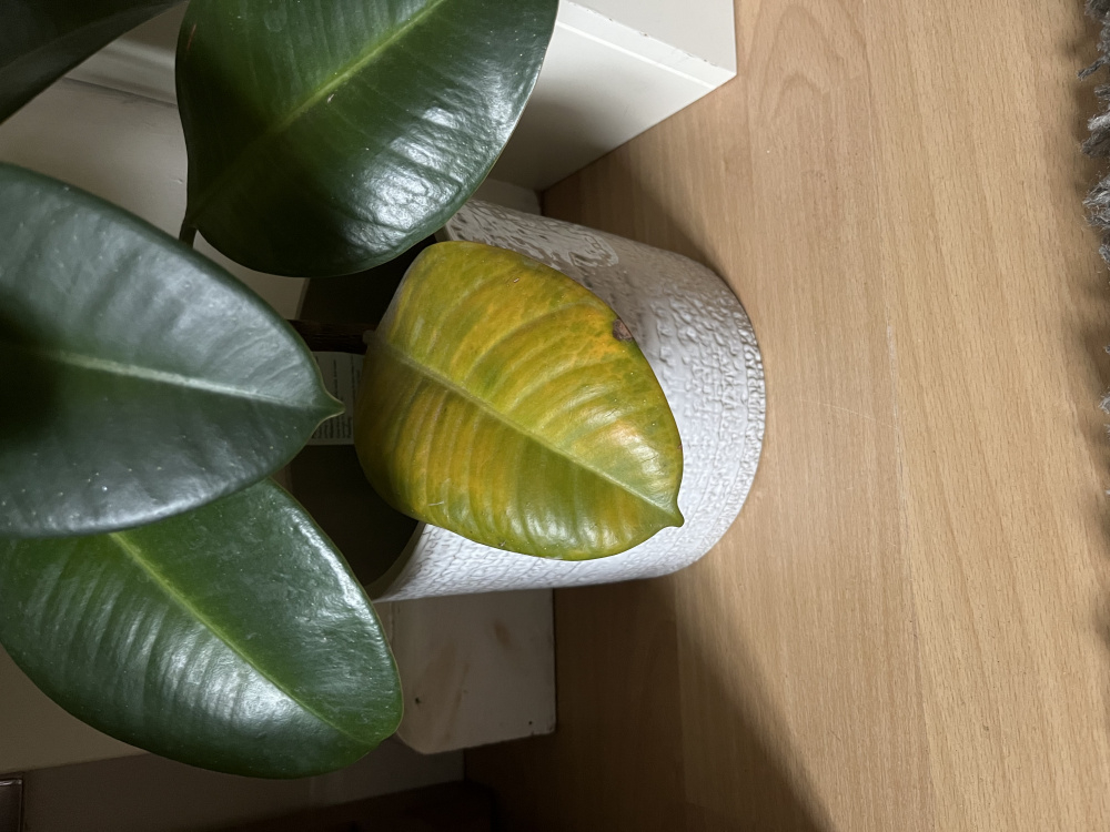 Hi. Can anyone help with my rubber plant that I’ve had for a couple of years. The bottom leaf has turned almost completely yellow. The rest of the leaves appear healthy and it is still putting out new leaves as it grows taller.