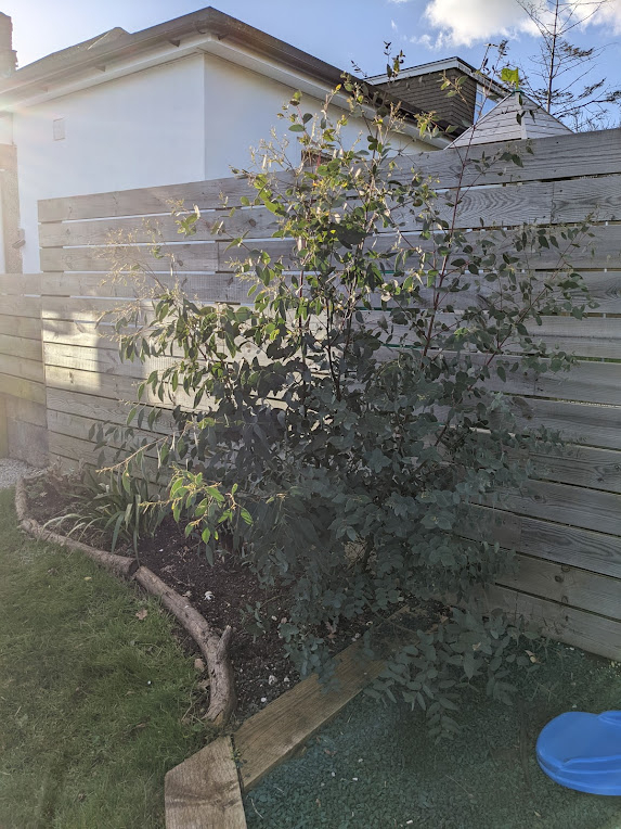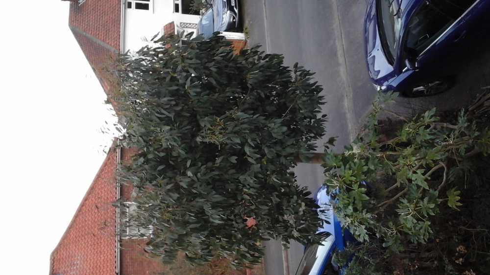Not the greatest pic as it's getting dark and looks far better from the road. It was nicely shaped until the recent storms. The picture is taken from our front bedroom to give you an idea of size and the trunk is 10-12" in diameter. The fatsia is over 6ft and not that happy as it's had to be moved twice in the last two years and will be moving again back to its spot when our building work is done. It didn't mind being in close proximity to the eucalyptus, just not as happy in the wind and bright sun, and I've not had any problems growing anything under it tbh.
