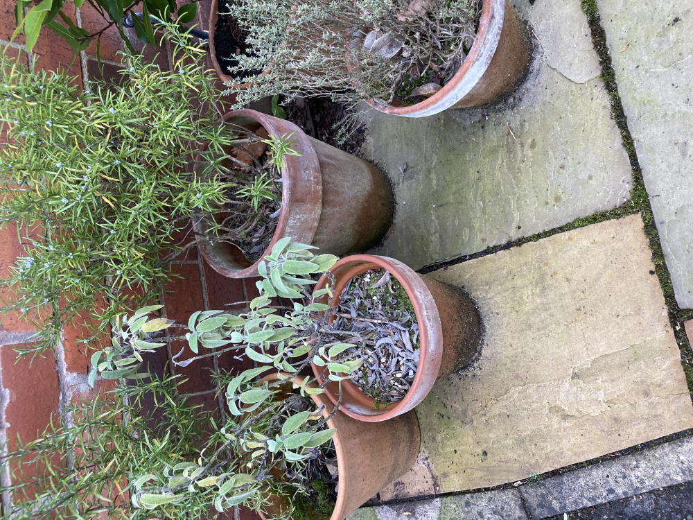 They all need repotting in gritty compost, raised off the ground with pot feet, or similar, so that they can drain properly and placed in the sun, when we get some! Water after repotting and only again when the top couple of inches of the compost feels dry. You could prune the sage in a few weeks' time when it starts growing again, to obtain a bushier plant - use the sage you cut for cooking!