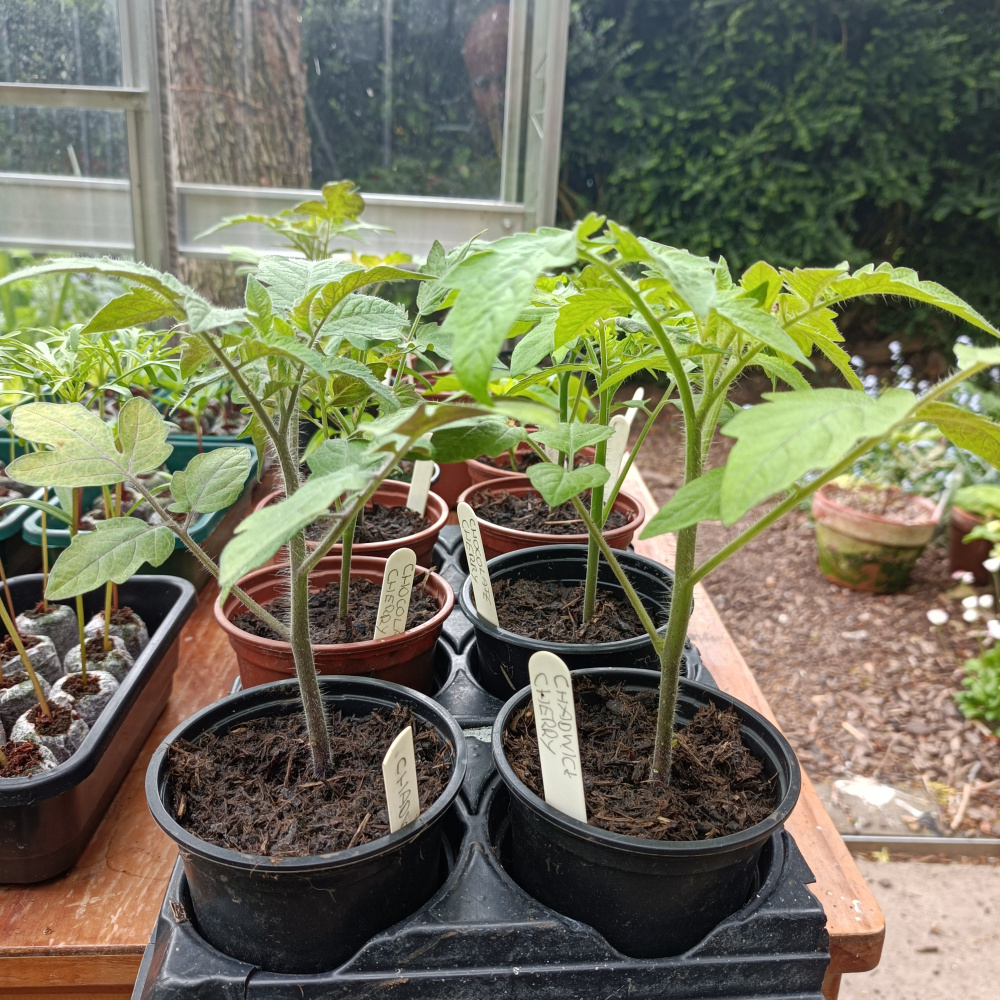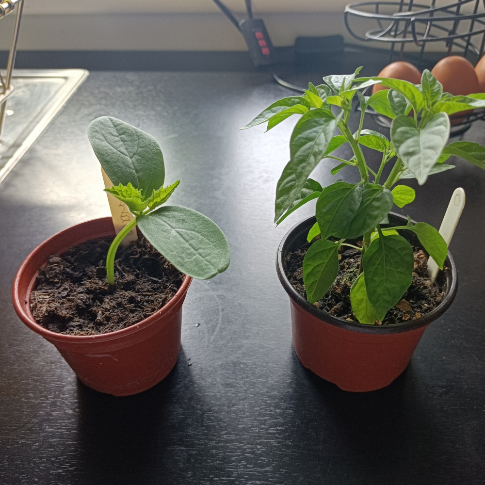 Cucumber and dwarf chilli still on a windowsill indoors.