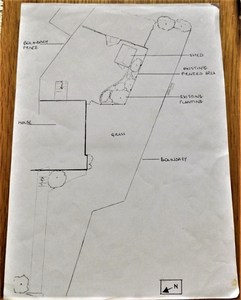 That's fine @Harriet-. The best thing to do is to trace it - greaseproof is fine if you don't have tracing paper. Before you do that, put in the things that you absolutely can't alter [trees, patio etc] in pen. This kind of thing: Then you can either print a load of copies of that basic layout, or trace several copies, but leave the printing out, so that you can then sketch all sorts of ideas. You can play about with all sorts of layouts, according to your needs - washing line, siting the rabbit hutch etc, and include your new patio, as well as some layouts for planting, depending on the aspect. You can screen off the things you don't want to see using planting, but it's probably worth giving yourself a bit of time to see how the sun tracks round, and how it affects different areas, and what room you actually have. Don't worry about shade - there are plenty of plants which will work in it.