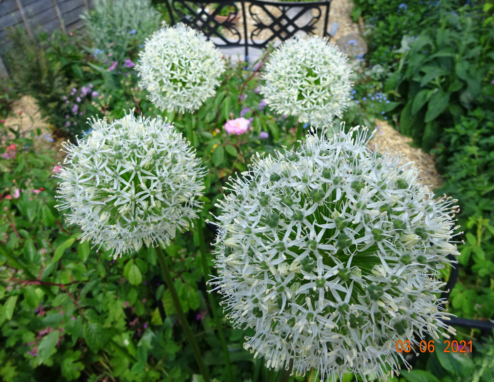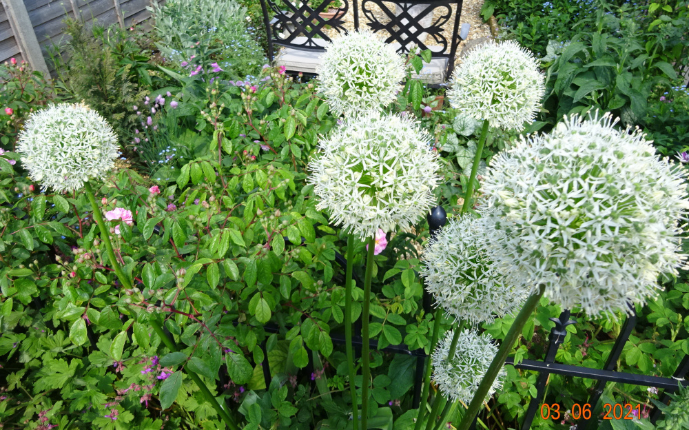 ..the white one is 'Warren Hills'.. less vigorous,.. long flowering.. ALLIUM stipitatum 'Mt. Everest'... I grow this for the bees, they swarm around it.. large, strapping grey/green foliage, tall spikes of flowers..