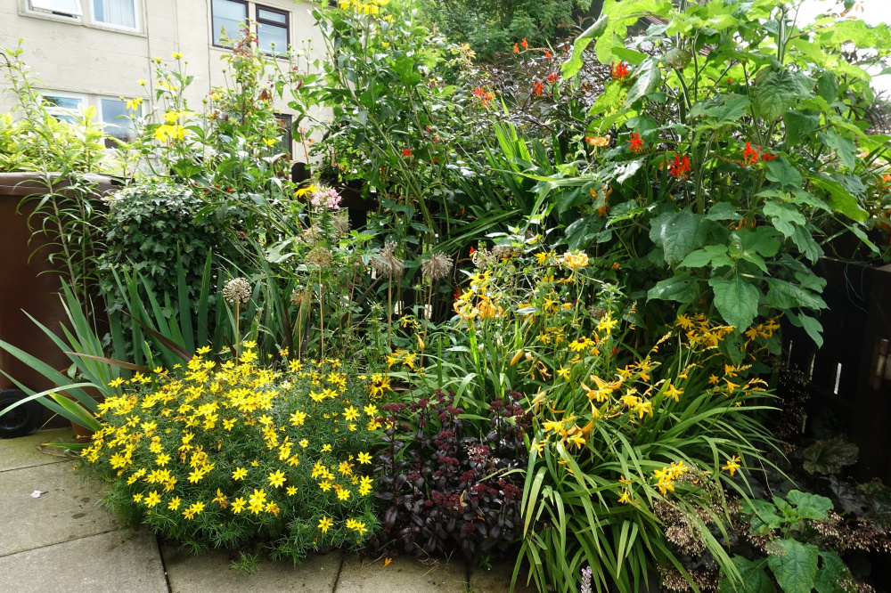 Crocosmia George Davidson & Lucifer just going over with coreopsis zagerb