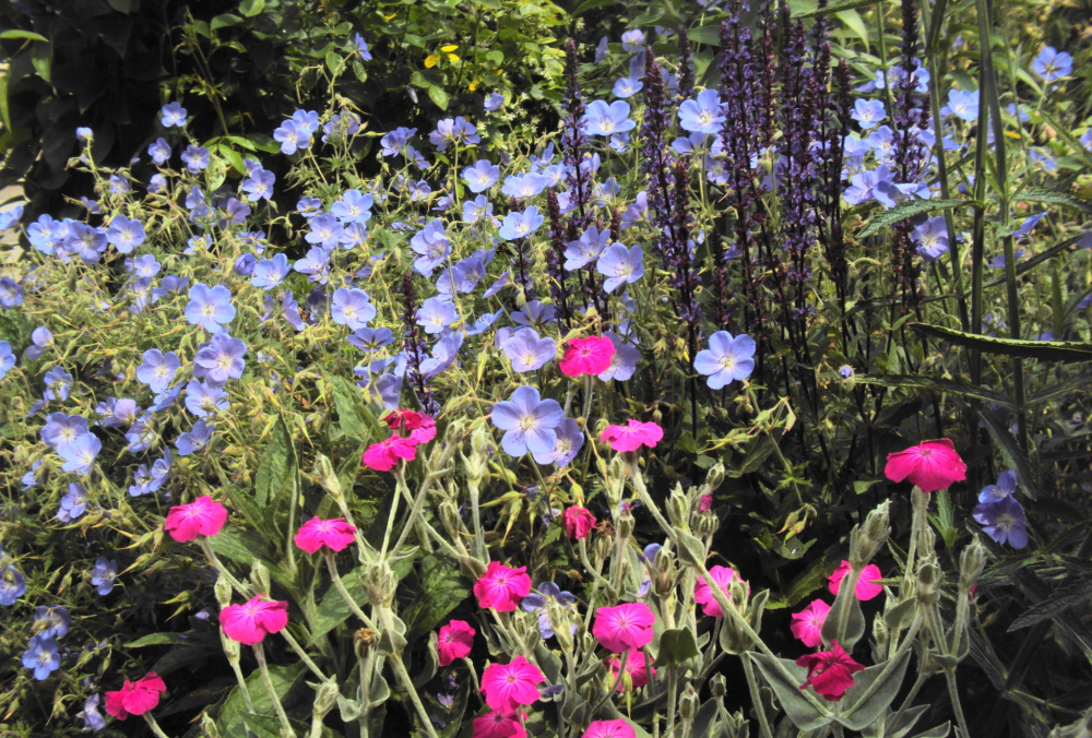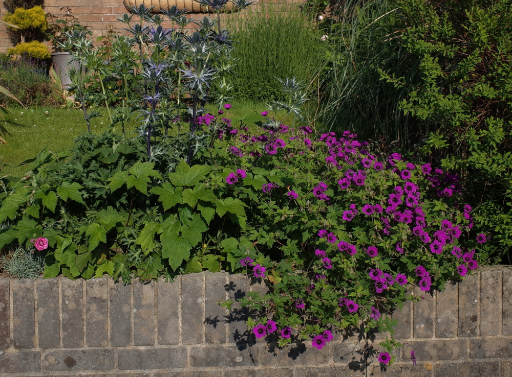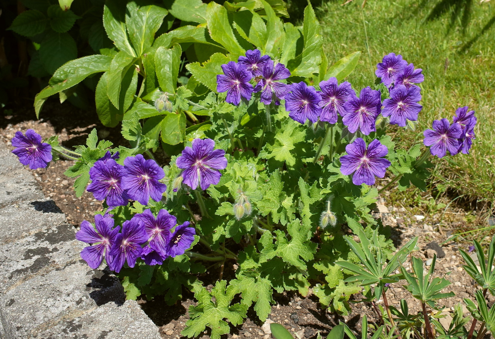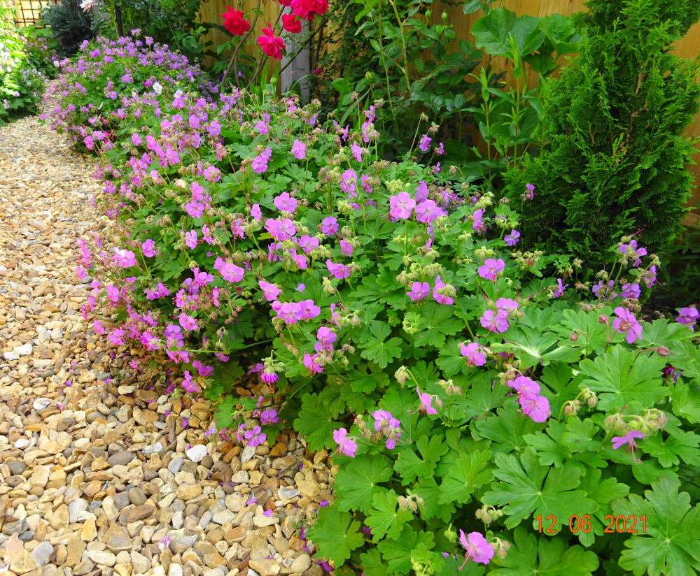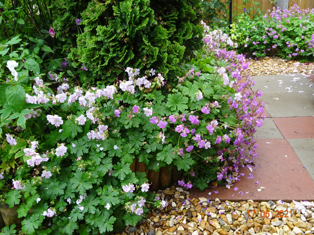 Geranium himalayense 'Gravetye'.. Geranium x cantabrigiense,.. in variety... all flower mid May-mid July.. mauve forms.. 'Karmina'..'Cambridge'..'Vorjura'.. all rather similar.. ...white forms mixed in.. 'Biokovo'.. 'Hilary Rendell'... can't tell the difference to be honest.. ..'Crystal Rose' is an interesting colour break..