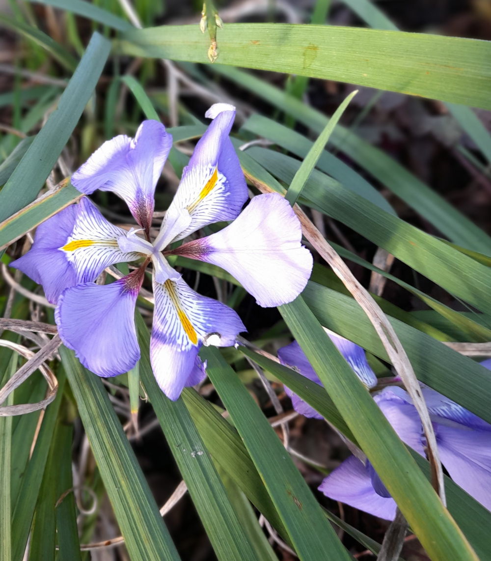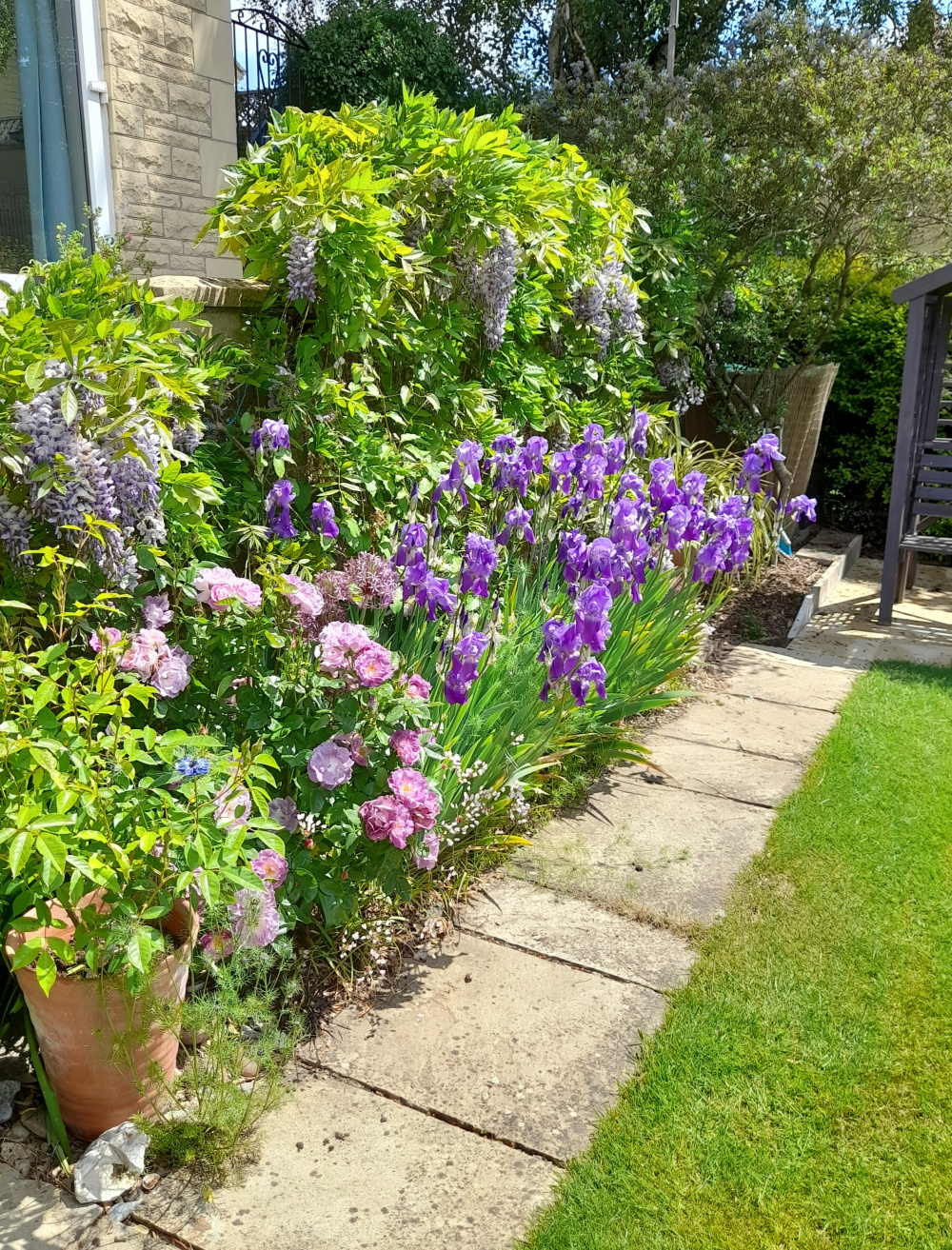Two irises, 1st is winter flowering Iris unguicularis ,(Algerian Iris) and 2nd pic is an unknown tall bearded purple Iris. If I'm lucky it sometimes coincides with the wisteria!