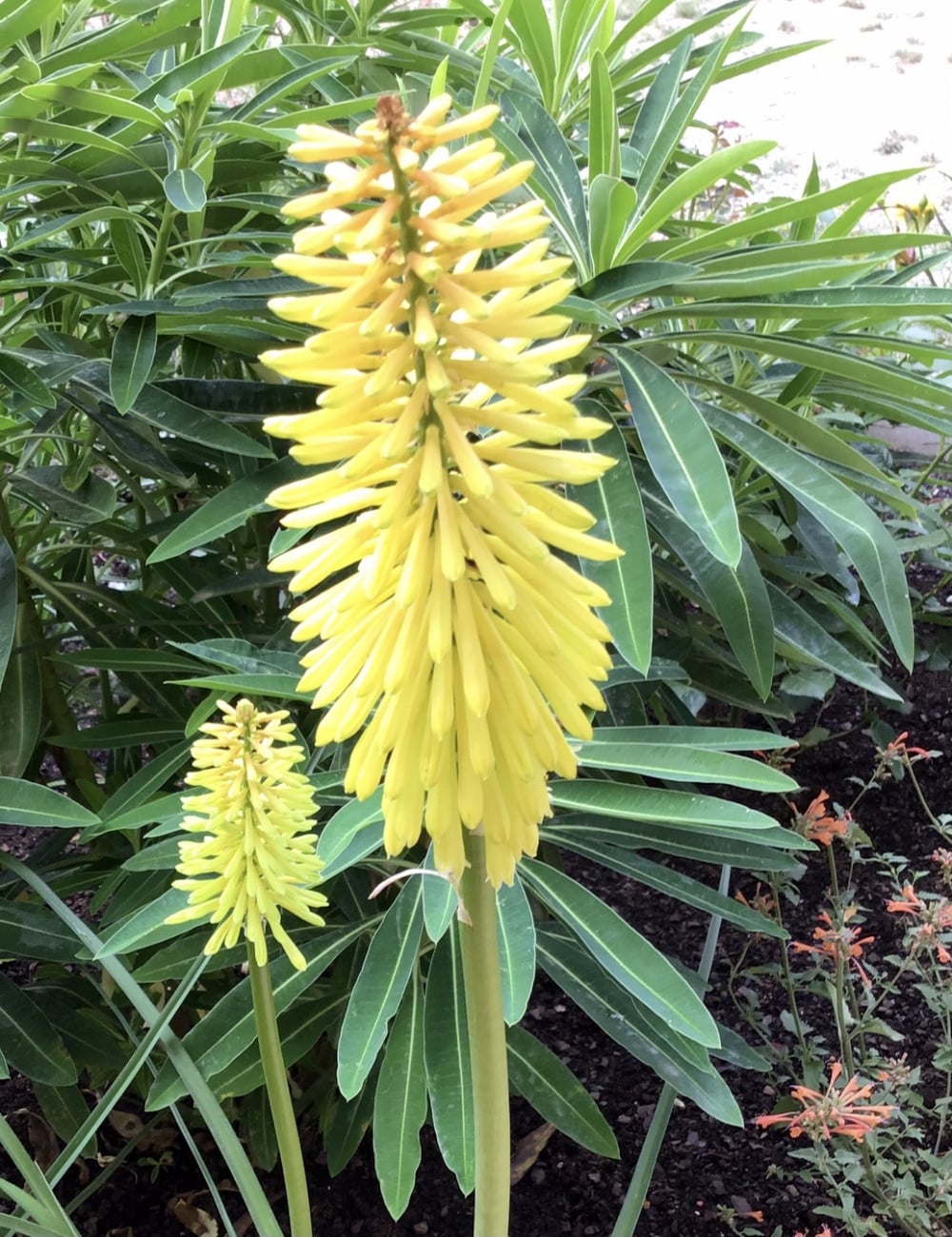 Kniphofia Wrexham Yellow. I loved the pure lemon but got rid as the enormous spread of the strapping leaves far exceeded the value of the flowers in a small border: