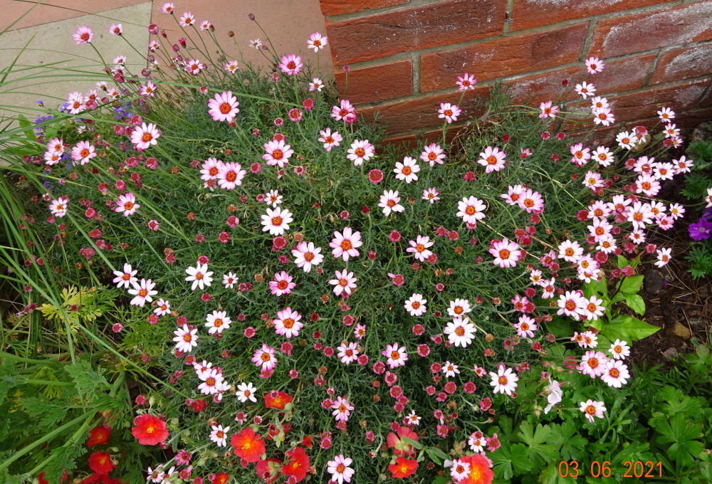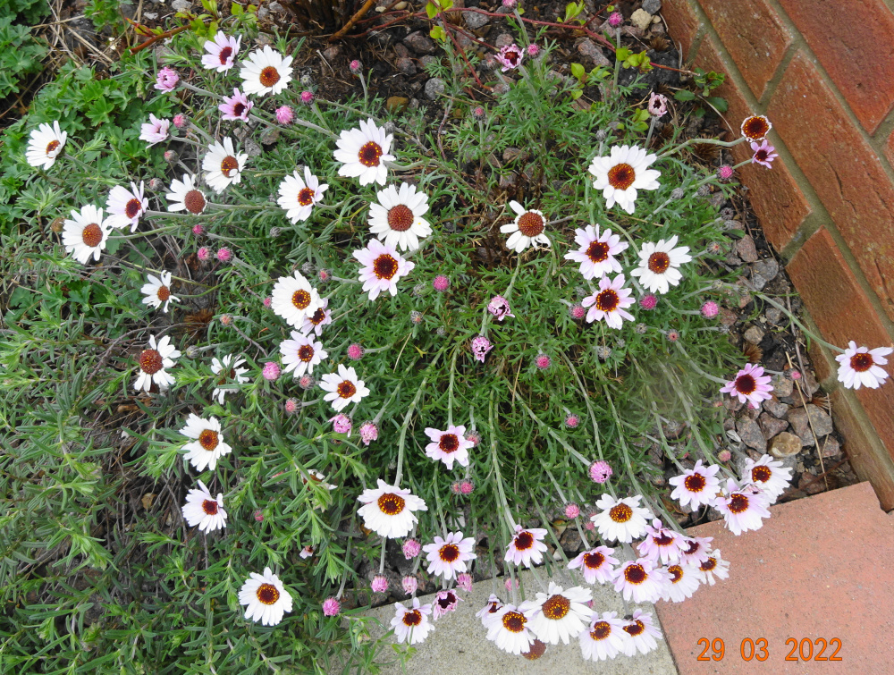 Rhodanthemum 'Tangiers'.. flowers year round... 'Casablanca' is similar.. photo from 2 days ago..