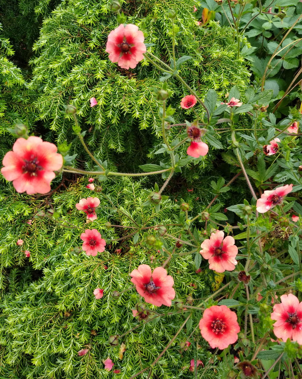Here's potentilla nepalensis Roxana. It has an odd optical illusion effect. When I see it through the kitchen window, about twenty feet away, it looks plain orange. The first time I noticed I went outside to look, thinking it had reverted or faded or