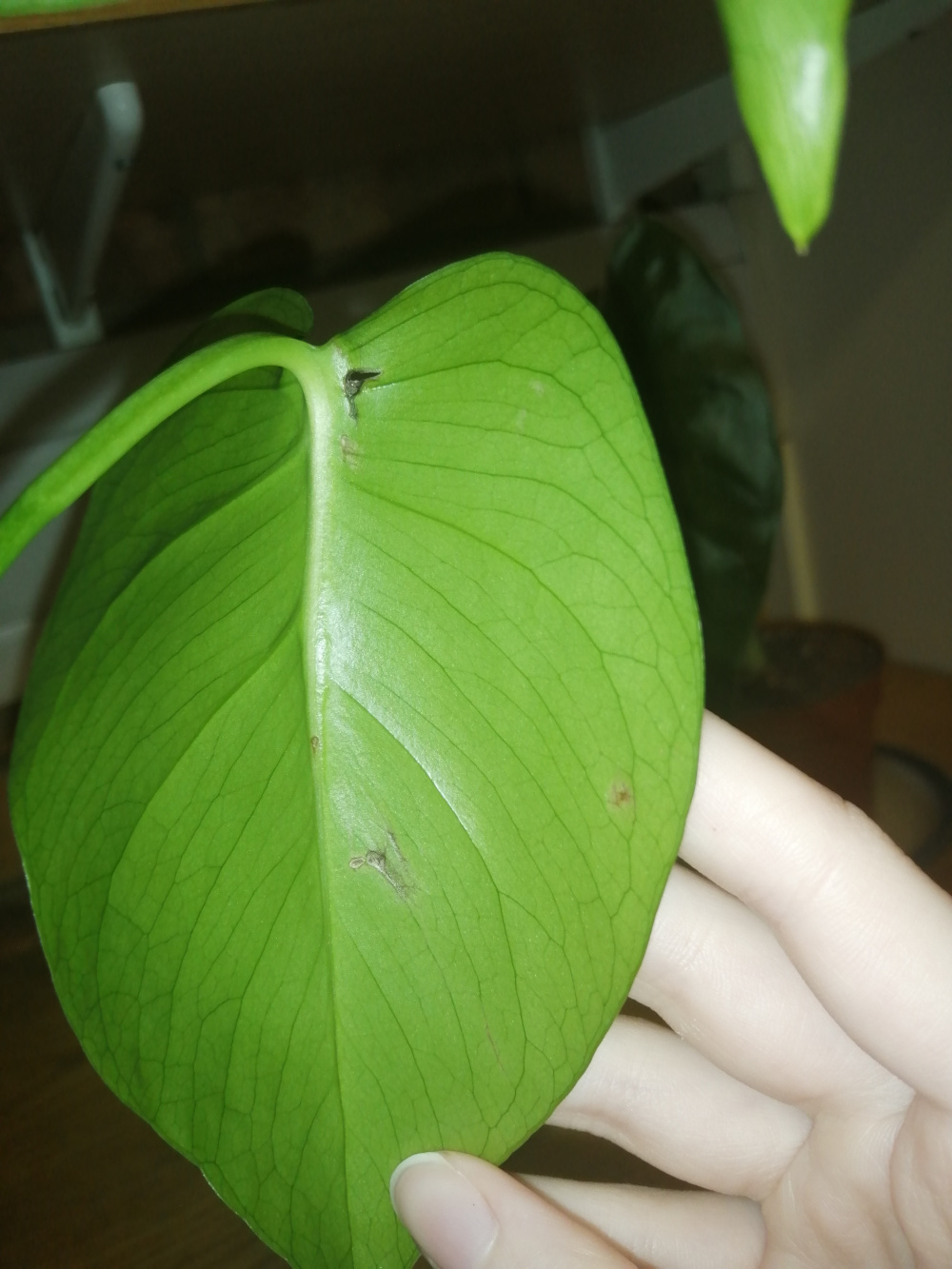 When I first got this monstera it had root rot but that has been a while now and it's roots are much healthier after a month but these light brown markings keep appearing and I don't know the reason why and have looked everywhere to try find a matching picture of the problem to no success. Housing for this monstera is pretty simple as it's normally on a windowsill all day as I get a lot of pretty direct sunlight from it and then placed in my bathroom at night for an average of 3 hours after shower for the humidity then it's back on the windowsill for the night so I don't know what the issue could be so if you know that would be great thank you. There are a couple really light brown markings on the 2nd picture monstera leaf one of which is a thin line going across at the bottom that has caused the leaf to look a little folded in that area.