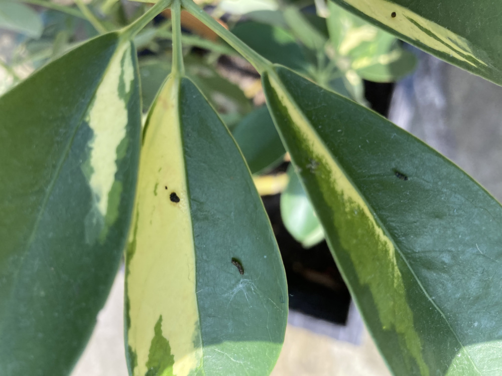 There seems to be some little bugs eating at my umbrella leaves and either laying eggs or pooing on the leaves and stems.