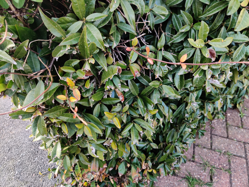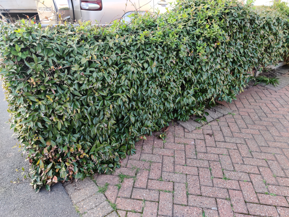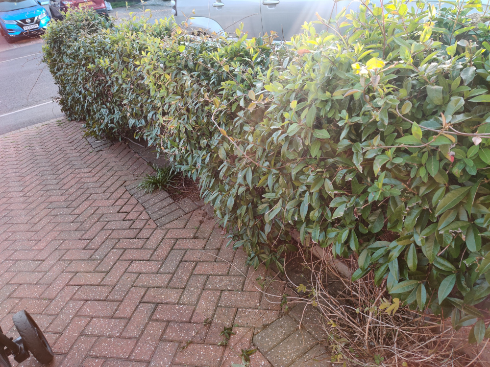 I've just moved and the hedge in the driveway looks worrying. I'm not sure what species it is. The leaves are starting to look jagged - is this a fungus or from a hedge cutter? And then there's the patch of brown leaves at the end. Help please xx