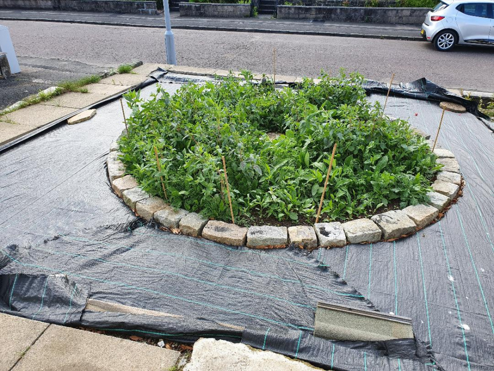 Wild flowers planted in the middle, I hope, or they could all be weeds And repurposed the old cobbles to make a wee boundary.
