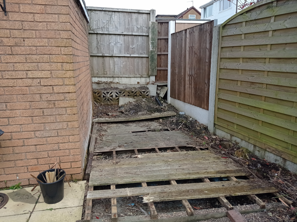 Long story short there's been a problem with green mould in the garage, we had an old worn down summerhouse next to it. I was advised the issue was water pooling at the back of the garage cause of the angle that rain was coming off the summer house roof. So last summer I tore the summer house down leaving some old decking which I've just started taking up and once done making some kind of plant bed.
