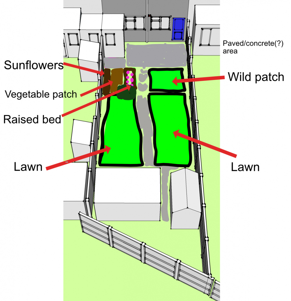 Just to give more context I've dug out a (not terribly to scale) diagram of the garden I had to make up for other purposes and put some notes about what I've got in the rest of it at the moment. The house end sits at roughly east-northeast if that helps give an idea of what sort of sun the garden should get in general