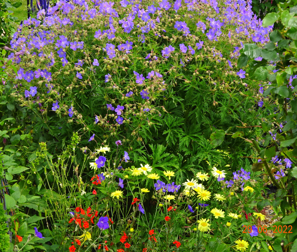 ..meadow-y.. Geranium pratense, Anthemis, Alonsoa ..