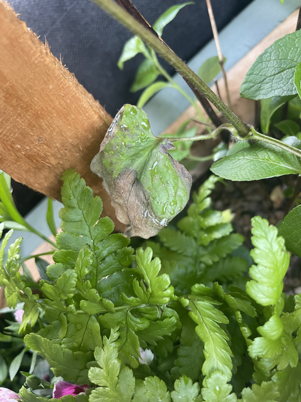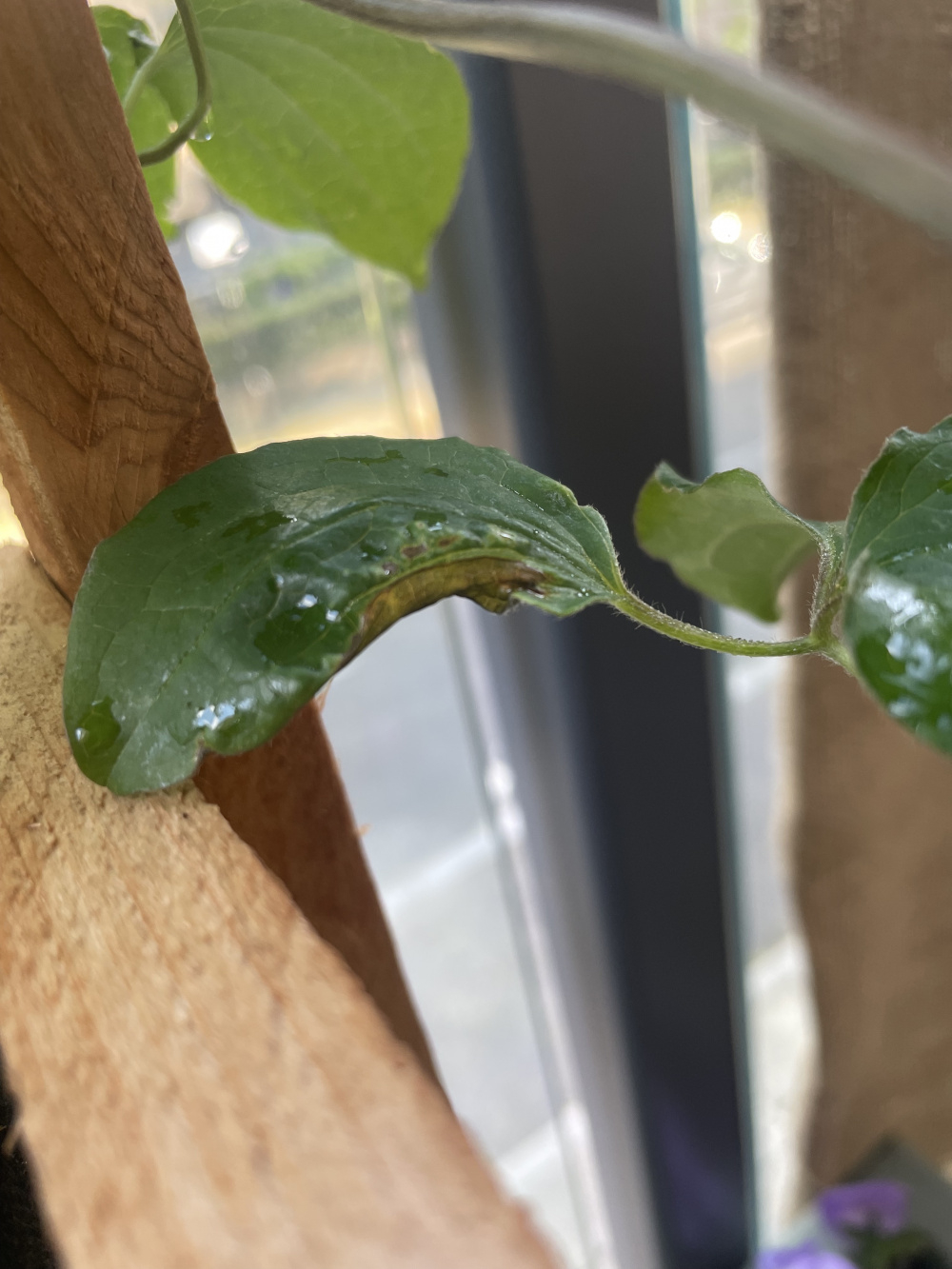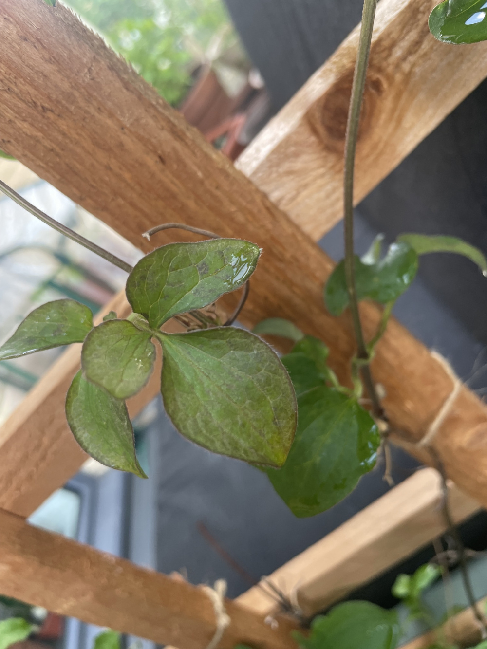 Does anyone know if this looks like Clematis wilt? I've just noticed that some leaves have brown marks on them and unfortunately one of the new stems had drooped over - I immediately thought it was due to not getting enough water (hadn't had a drink in a couple of days) so I gave it a good drink but after a couple of hours it hadn't perked up, out of panic I've cut that shoot back to the base.