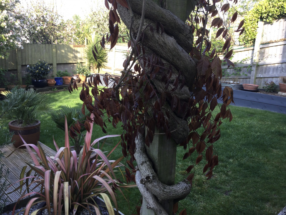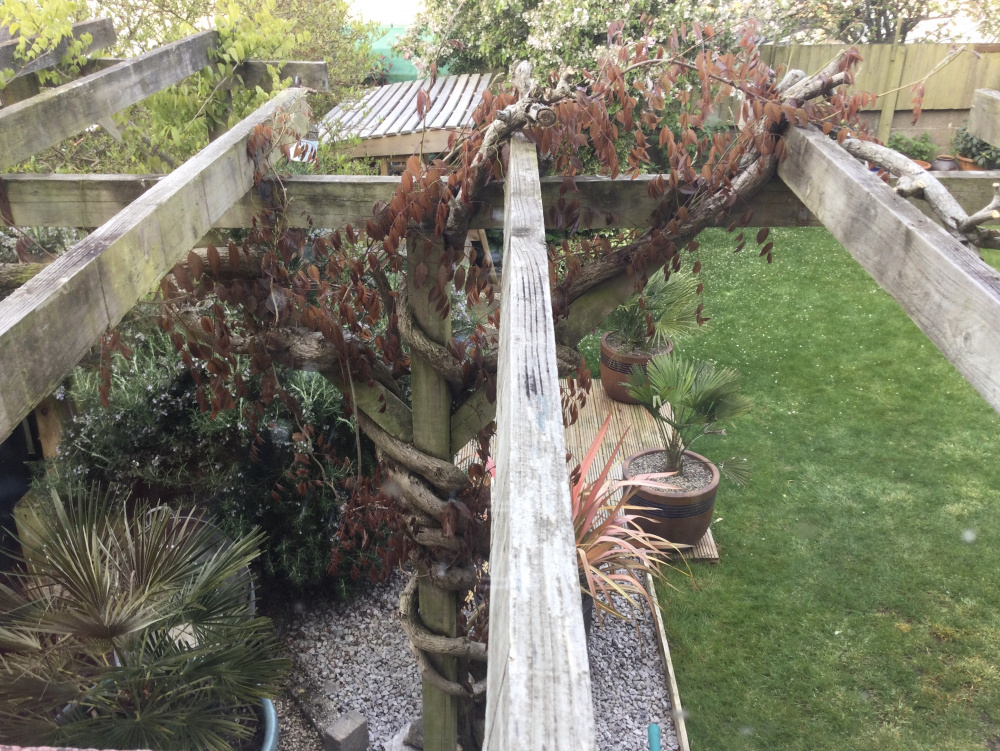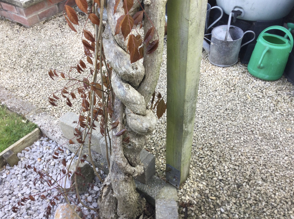 ..the new red growth seems to be twining anti clockwise, which makes me think it's a sucker from the rootstock, as the old plant is apparently dead. Wisteria are normally grafted onto Chinese wisteria rootstock [Wisteria sinensis], so if it is that, then it will be twining anti clockwise.